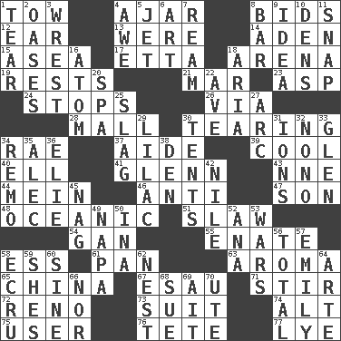 ACROSS 1. Pull behind 4. Partly open 8. Auction offers 12. Ewer handle 13. Past tense of be (plural) 14. An important port of Yemen 15. Toward the sea 17. Singer James 18. Sports stadium 19. Musical pauses 21. Spoil 23. Cleo's killer 24. Ceases 26. By way of 28. Promenade 30. Pulling apart 34. Actress Charlotte 37. Assistant 39. Calm and collected 40. Pipe bend 41. American astronaut and politician John 43. Compass dir. 44. Chow _ 46. Opposed to 47. Boy, to dad 48. Pertaining to the sea 51. Cole _ (cabbage dish) 54. Separate the seeds from cotton 55. Maternal 58. Double-curved letter 61. Baking dish 63. Scent 65. Large country 67. Son of Isaac 71. Use a swizzle stick 72. Western Nevada city 73. Set or collection 74. Keyboard modifier key 75. One who makes use of a thing 76. False hair 77. Sodium hydroxide DOWN 1. Pull into pieces 2. Fertile tracts in a desert 3. Obtain by seizing forcibly or violently 4. Deep reverence 5. Type of plane 6. Nonscientific branch of learning 7. 480, 500 or 516 sheets of paper 8. Oblong piece of solid material 9. It may be bright or harebrained 10. Habitations of wild animals 11. Fastener 16. Tiny particle 18. Roberta Peters solo 20. Health resort 22. "___ Maria" 25. Volcanic refuse 27. Curve 29. Pale purple color 30. Portable shelters 31. Charged particles 32. Words to Nanette 33. Small, secluded valley 34. San ____ (Riviera town) 35. Actor Baldwin 36. Writer Wiesel 38. Lair 42. "Death on the ____" 45. Tired old horse 49. California wine valley 50. _ tizzy (2 wds.) 52. Santa ___, CA 53. Armed conflicts 56. "_____ Recall" 57. Poet Dickinson 58. Shade of tan 59. "______ My Girl" (Turtles hit) 60. Trig term 62. A home for chicks 64. Johnson of "Laugh-In" 66. And not 68. Take to court 69. Small island 70. Shoshoni