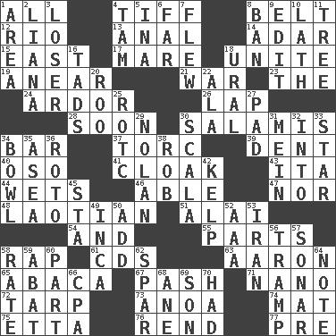 ACROSS 1. 100% 4. Small quarrel 8. Waist strap 12. _ de Janeiro 13. Of or related to the anus 14. The sixth month of the Jewish calendar 15. 90 degrees 17. Female horse 18. Join together 19. Approach 21. Armed conflict 23. Definite Article 24. Zeal 26. Pet locale 28. Within a short period 30. Deli grouping 34. Drinking establishment 37. Torque (variant) 39. Undesirable depression on a surface 40. Bear (Spanish) 41. Cover or conceal 43. Call ___ day 44. Moistens 46. Competent 47. And not 48. Of or relating to Laos or its people 51. Jai ____ 54. Plus 55. Actors' quests 58. Reproach for some lapse or misdeed 61. Music discs 63. Composer Copland 65. Phillipine bananalike plant 67. Romantic infatuation 71. Billionth: prefix 72. Canvas cover 73. Small Philippine buffalo 74. Floor covering 75. Singer James 76. Tear apart 77. Before (prefix) DOWN 1. Length times width 2. Climbing, woody, usually tropical vines 3. Failure 4. Scottish cap 5. _ tizzy (2 wds.) 6. Distant 7. Soared 8. Bar 9. Prepare for publication 10. Thin strip of wood or metal 11. Family _ (genealogy) 16. Bits 18. Mountain range 20. Friend of Pooh 22. Insect wing 25. College mil. group 27. Writing tablet 29. Pitcher Ryan 30. Any of the three canals of the cochlea 31. Chow _ 32. To the inside or interior of 33. Play the lead 34. Soup holder 35. Toward the sea 36. Printing process, for short 38. Director Reiner 42. Seaweed 45. R.R. building 49. South American Indian 50. Say or write further 52. Auto club (abbr.) 53. SW Asia republic 56. _____ steamer (cargo ship) 57. Underwater navigation system 58. Pace 59. Blind as ____ 60. Role in a play 62. Coast Guard woman 64. Musical sound 66. Tax preparer (abbr.) 68. One (Scot) 69. Manchild 70. Possessed