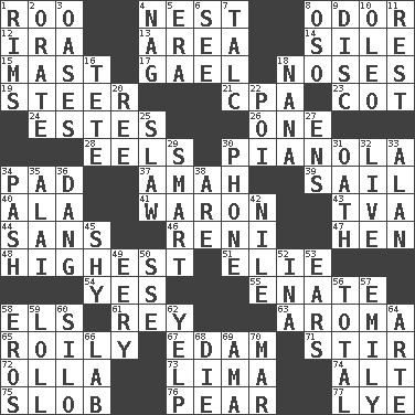 ACROSS 1. Friend of Pooh 4. Egg locale 8. Aroma 12. Retirement account (abbr.) 13. Length times width 14. Filth; sediment 15. Vertical spar for supporting sails 17. Highlander 18. Olfactory organs 19. Navigate 21. Tax preparer (abbr.) 23. Small bed 24. _____ Park, CO 26. Single 28. Snakelike fish 30. Player piano 34. Groovy apt. 37. Housemaid 39. Move on water 40. In the manner of 41. Make _____ (do battle with) 43. Federal power corp. 44. Without 46. Painter Guido (1575-1642) 47. Layer 48. Having the greatest elevation 51. Writer Wiesel 54. Affirmative reply 55. Related on the mother's side 58. Raised railways 61. Marina Del _, California 63. Odor 65. Agitated, as a liquid 67. Dutch treat 71. Disorderly outburst 72. Spanish pot 73. Pale green bean 74. The first octave above the treble staff 75. Messy guy 76. Lightbulb-shaped fruit 77. Sodium hydroxide DOWN 1. Basketball hoops 2. Declaim 3. Fertile tracts in a desert 4. Tired old horse 5. Epoch 6. Perceive with the eye 7. Baby powder 8. Bear (Spanish) 9. Compact _ 10. Butter sub 11. Relief 16. Wig 18. Nanny 20. To separate or throw off 22. Luau course 25. Cole _ (cabbage dish) 27. Followers of ems 29. Don Adams' spy role 30. Give a jingle 31. Pledge 32. Moving, as bait 33. Actor Alda or Thicke 34. Romantic infatuation 35. Jai ____ 36. Mild oath, euphamism for damn 38. "We ___ not amused" (Victoria) 42. "Death on the ____" 45. Like a shrinking violet 49. Suggestive of the supernatural 50. Compass dir. 52. _ tizzy (2 wds.) 53. Hearing organs 56. "_____ Recall" 57. Poet Dickinson 58. Greek god of love 59. Hang loosely or laxly 60. Grain storage tower 62. Sharp bark 64. Johnson of "Laugh-In" 66. Experiment locale 68. Expire 69. Nursemaid (var.) 70. Impair