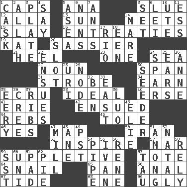 ACROSS 1. Balmoral and tarboosh 5. Santa ___, CA 8. Change direction abruptly 12. Silent film actress Nazimova 13. Player for Phoenix 14. Confronts 15. Kill 16. Pleas 19. Krazy ___ of comics 20. More impudent 21. Person who is morally reprehensible 23. Single 24. Ocean 27. Part of speech 30. Connect, as a bridge 31. Disco prop 34. Merit 35. Shade of tan 38. Perfect 40. Celtic language 41. 4th largest of the Great Lakes 42. Followed as a consequence or result 44. Confederate soldiers (slang) 45. Lacquered or enameled metalware 46. Consenting reply 47. Atlas unit 50. SW Asia republic 53. Stimulate to action 57. Impair 59. Supplying deficiencies 63. Carryall 64. Slow-paced one 65. Baking dish 66. Of or related to the anus 67. Event that recurs at intervals 68. Compass dir. 69. Unsightly DOWN 1. Keg 2. Assad's deity 3. Food holder 4. Declare 5. Toward the sea 6. Religious women 7. Pismires 8. Put into a specified state 9. Flowery wreath 10. Shoshoni 11. Double-curved letter 14. Female horse 17. River (Sp.) 18. Car or cant ending 20. Position in a hierarchy or organization 22. Takes place subsequently 24. Coast Guard woman 25. Hearing organs 26. Singer Murray 28. RI univ. 29. Connecting point 30. Sowing specialist 32. Benjamin's nick name 33. Compass direction 35. Suggestive of the supernatural 36. Algonquian 37. Teases 39. Nilotic language 43. Writer Wiesel 47. Place where flour is made 48. One (Scot) 49. Pacific Standard Time (abbr.) 51. Amid 52. Brizilian seaport 54. Corncob 55. "Terrible" tsar 56. French philosopher Descartes 58. Have confidence or faith in 59. Fast jet (abbr.) 60. Corn or form start 61. Writing tablet 62. Sliced dessert 63. The 19th letter of the Greek alphabet