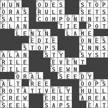 ACROSS 1. Attila the _ 4. Lyric poems 8. Cease 12. Mouths or openings 14. General guideline 15. Puts into a specified state 16. Suttee (variant) 17. Parts 20. Flair 21. Make a knot 22. Plant holder 23. Soviet premier 1918-24 27. Unable to walk 29. Singer Brickell 31. Washington bills 34. Discontinues 35. Taverns 36. Actor Alda or Thicke 39. Filthy place 41. System (abbr.) 42. Cause heat under the collar 43. Happening 46. Do some clerical work 47. Stitched 48. Relating to the mouth 51. Sleazy 54. Keyboard modifier key 56. To separate or throw off 58. I made a mistake 61. Producing rotation 66. Frame or body of a ship 67. Ship's personnel 68. One of the Great Lakes 69. Type of rug 70. Sew up the eyelids of hawks and falcons 71. Plant excrements 72. Consume DOWN 1. Flexible conduit 2. Mountain range 3. Brizilian seaport 4. The grampus (Milton) 5. Superhero pair 6. Shade tree 7. Back-to-school mo. 8. Compass dir. 9. 3-inch nail 10. Von Bismarck 11. Inconspicuous attention getter 13. Trig term 18. Lubricate 19. Teachers' org. 24. Remaining after all deductions 25. Wedding promise 26. Cuts off 28. Wet 30. _____ Park, CO 32. Followers of ems 33. Fast jet (abbr.) 34. Scornful expression 36. Sandy's bark 37. Cards in a Roman deck? 38. One to whom something is allotted 40. Jacques Cousteau's middle name 44. She-sheep 45. Compass dir. 49. Nonscientific branch of learning 50. Flowery wreath 52. Capital of the state of Qatar 53. You are 54. Curves 55. Old wives' tales, e.g. 57. Nights before holidays 59. Entreaty 60. Narrow board 62. Leather borer 63. Period 64. Mouth edge 65. Affirmative reply