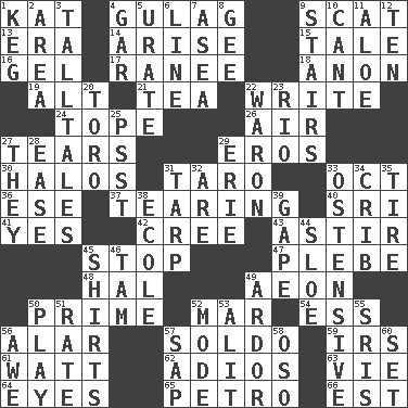 ACROSS 1. Krazy ___ of comics 4. POW camp 9. Leave at once 13. Epoch 14. Get up 15. Lie 16. Set 17. Indian princess (variant) 18. Soon (poet.) 19. The first octave above the treble staff 21. Beverage made from leaves 22. Compose 24. Drink excessively 26. Wind 27. Pulls apart 29. Greek god of love 30. Radiant circles of light 31. Edible starchy tuberous root 33. Sep. follower 36. Compass dir. 37. Pulling into pieces 40. Indian title of respect (Mr.) 41. Consenting reply 42. Algonquian 43. Moving about 45. Cease 47. Cadet 48. Actor Linden 49. A really long time 50. A-one 52. Impair 54. Curvy letter 56. Having or resembling wings 57. Twentieth part of a lira 59. Big collection agency 61. Electrical Unit 62. Goodbye (Sp.) 63. Compete 64. Sight organs 65. Stone: prefix 66. Eastern Standard Time (abbr.) DOWN 1. Barrel 2. Length times width 3. Baron Munchausen's specialties 4. Slender fish 5. A salt of uric acid 6. Actor's bit 7. Toward the sea 8. Turn to the right 9. Flight of steps 10. Patter 11. Medicinal plant 12. "___ Little Indians" 20. "Corrida" creature 22. Make _____ (do battle with) 23. River (Sp.) 25. Inconspicuous attention getter 27. Those people 28. Relaxation 29. One of the Great Lakes 31. Canvas cover 32. "We ___ not amused" (Victoria) 33. Clearly or manifestly demonstrative 34. Baby bed with high sides 35. Become fatigued 38. Learning spot: Fr. 39. Yawn 44. _ gin 45. Upper-body garments 46. Scottish cap 49. Zeal 50. Live dramatic performance 51. Pace 52. Method 53. Set down 55. Indian titles of respect 56. Deep reverence 57. Plant excrement 58. Bear (Spanish) 60. Arrange properly for use