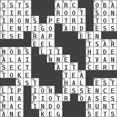 ACROSS 1. Fast planes 5. Curve 8. Chief or king in Benin or Nigeria 11. Become fatigued 12. Carrot, for example 14. Boy, to dad 15. Metal shackles 17. _ dish (used to culture cells) 18. Small child 19. Small, flat, pigmented spot on the skin 21. Find the sum of 22. Double-curved letter 23. Compass dir. 24. Strike 25. Car or cant ending 27. Snakelike fish 28. Russian ruler of old 31. Disorderly crowds 35. Cards in a Roman deck? 37. Flintstone garb 38. Jai ____ 39. Compass dir. 41. _ the terrible 42. Religious group 43. Small island 45. Sure thing 46. Puff or smoke 47. Afternoon social gathering 49. Fast jet (abbr.) 51. Actor Linden 52. Eastern Standard Time (abbr.) 55. Mouth edge 57. Electrically charged atom 60. Gist 62. Retirement account (abbr.) 63. Peter (Polish) 65. Fertile tracts in a desert 66. Apple computer (short form) 67. Southeast Asian peninsula 68. The smallest animal of a litter 69. One (Scot) 70. Cask 71. Arranges properly for use DOWN 1. Vertical member of a panel or frame 2. Fathers 3. Marketplace scale 4. Posted 5. "We ___ not amused" (Victoria) 6. Roll call or roster of names 7. Drawstring 8. Clearly or manifestly demonstrative 9. Scornful sounds 10. Pismires 13. Periodic rise and fall of the sea level 16. Title for a man of rank and authority 17. Cotton for raincoats, e.g. 20. Highlander 26. Moral principle 29. The sixth month of the Jewish calendar 30. Monthly bill 31. Vertical spar for supporting sails 32. Margarine 33. Keyboard key 34. Locates 36. _ tizzy (2 wds.) 40. One or the other 44. Afternoon social gatherings 48. In addition 50. Native american tent (variation) 52. Follow as a consequence or result 53. Odor 54. Trials 55. Pale green bean 56. SW Asia republic 58. Pig sound 59. Connecting point 61. Hearing organs 64. Coat; cloak