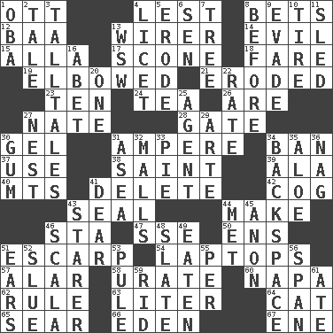 ACROSS 1. Baseball player Mel 4. For fear that 8. Stakes 12. Sound made by sheep 13. One who wires 14. Tending to cause great harm 15. Silent film actress Nazimova 17. Biscuitlike quick bread 18. Conductor's collection 19. Shoved, as through a crowd 21. Eaten away 23. "___ Little Indians" 24. Afternoon social gathering 26. "We ___ not amused" (Victoria) 27. Nathan's nickname 28. Yard entry 30. Set 31. Electrical Unit 34. Forbid 37. Purpose 38. Virtuous person 39. Wing 40. Mountains (abbr.) 41. Keyboard key 42. Gear tooth 43. Lick closed 44. Cause to be 46. R.R. building 47. Compass dir. 50. Followers of ems 51. Fortification 54. Portable computers 57. Having or resembling wings 58. A salt of uric acid 60. California wine valley 62. General guideline 63. 61 cubic inches 64. Domesticated feline 65. Singe 66. Genesis locale 67. Compass dir. DOWN 1. Chief or king in Benin or Nigeria 2. Falsehood 3. Baron Munchausen's specialties 4. It is permitted: Lat. 5. Eat (away) 6. Elected rep. 7. Relationship diagram 8. Prior to 9. Dodge 10. Become fatigued 11. Downhill vehicle 13. Compass dir. 16. Collude with 20. Single 22. Assign a rank or rating to 25. Rep 27. A home for chicks 29. Johnson of "Laugh-In" 30. Chewing product 31. At sea 32. Shopping centers 33. Sliced dessert 34. Keyboard key 35. _ vera 36. Tired old horse 41. Letter starter 43. A viewer who gazes fixedly 44. Was introduced to 45. Soon (poet.) 46. Any of the three canals of the cochlea 48. Schedule 49. Ingested 51. Hearing organs 52. Change direction abruptly 53. Whine 55. For each 56. Connect, as a bridge 59. To free from 61. Had dinner