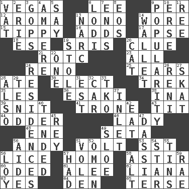 ACROSS 1. Viva Las _ 6. Area sheltered from the wind 9. For each 12. Scent 13. Words to Nanette 14. Had on 15. Likely to tip or tilt 16. Does sums 17. Domed church section 18. Compass dir. 19. Indian titles of respect 20. A slight indication 21. College mil. group 23. Everything 24. Western Nevada city 25. Rends 28. Had dinner 30. Opt 34. Long journey 35. French article 36. 1973 Nobel Price Winner (Physics) Leo 38. _ tizzy (2 wds.) 39. In a ____ (agitated or irritated) 41. Heavy duty weighing machine 43. Teat (slang) 44. More peculiar 46. Kenny Rogers chart-topper in '80 48. Compass dir. 49. Stalk of a moss capsule 50. Actor Griffith 51. Electrical Unit 53. Fast jet (abbr.) 56. Louse (plural) 57. Like (prefix) 58. Being in motion 60. Wrote a lyric poem 61. Toward shelter 62. Woody, climbing, usually tropical plant 63. Affirmative reply 64. Lair 65. Laconic DOWN 1. Large container 2. 4th largest of the Great Lakes 3. Republicans 4. Electrical Unit 5. Declare 6. Farming town in central California 7. Extremities 8. Greek goddess of the dawn 9. Teen's desire 10. Celtic language 11. To riddle 13. Drug cop 14. Place for singles 19. Took without asking 20. Domesticated feline 22. Single 24. Homes 26. Painter Guido (1575-1642) 27. Three-handed card game 28. In addition 29. Be inclined (to) 31. Eastern Standard Time (abbr.) 32. 4-wheeled motor vehicle 33. Ring climax 37. An arm off of a larger body of water 40. Watched over 42. Ingest 45. Marina Del _, California 47. Hyrax 49. A type of plum 50. Helper 51. Grand slam 52. Sign of something about to happen 54. Play the lead 55. Airtight sealed metal containers 56. Myrna of the movies 57. Possessed 58. The first octave above the treble staff 59. Actress Charlotte
