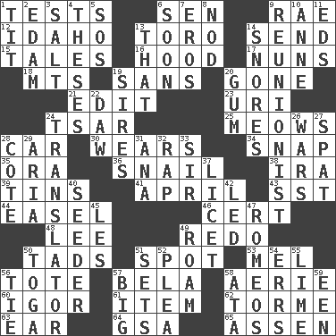 ACROSS 1. Trials 6. Elected rep. 9. Actress Charlotte 12. Potato state 13. "Corrida" creature 14. Post 15. Falsehoods 16. Parka part 17. Religious women 18. Mountains (abbr.) 19. Without 20. Went 21. Prepare for publication 23. RI univ. 24. Russian ruler of old 25. Catcalls? 28. Automobile 30. Erodes 34. Fastener 35. Mouth or opening 36. Slow-paced one 38. Retirement account (abbr.) 39. Canisters 41. Showery time 43. Fast jet (abbr.) 44. Artist's stand 46. An absolute certainty 48. Area sheltered from the wind 49. Do over again 50. Bits 51. Specific locale 53. Cartoonist voice _ Blanc 56. Haul 57. Actor Lugosi 58. Nest on high 60. Composer Stravinsky 61. A distinct part 62. Singer Mel 63. Ewer handle 64. Girls' org. (abbr.) 65. NE Netherlands city DOWN 1. Teat (slang) 2. Dutch treat 3. Table seasoning 4. College papers 5. Distress signal 6. Within a short period 7. Greek god of love 8. Allow head to fall sleepily 9. One who advocates reunion 10. Singer Murray 11. Begley and Asner 13. Not this but _ 14. Sounds asleep 19. Male parents of animals 20. Chewing product 22. Simpleton 24. Interpreter 26. Armed conflicts 27. Petty quarrel 28. ____ d'Azur (French Riviera) 29. Roberta Peters solo 31. Santa ___, CA 32. Strike 33. Title for a knight 37. It is permitted: Lat. 40. Sowing specialist 42. Directed 45. French article 47. Lover boys 49. Wander 50. Ancient Roman robe 51. Arranges properly for use 52. Entreaty 54. Blunders 55. Citrus frut 56. Neckwear 57. Of large size 58. _ moment's notice (2 wds.) 59. Car or cant ending