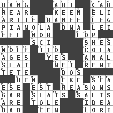 ACROSS 1. Mild oath, euphamism for damn 5. Tate display 8. Automobile 11. Tail end 12. Peachy ____! 14. Connecticut Ivy Leaguer 15. Nick name for Arthur 17. The wife of a rajah (variant) 18. Part of a journey 19. Player piano 21. Heredity factor (abbr.) 22. Luau accessory 23. Snakelike fish 24. And not 25. Trim (branches) 27. _-fi 28. "______ My Girl" (Turtles hit) 31. Undercover agent 35. It would 37. Root beer relative 38. Eons 39. Affirmative reply 41. Of or related to the anus 42. Narrow board 43. Remaining after all deductions 45. Monthly bill 46. False hair 47. Two (Sp.) 49. Layer 51. Make supply last 52. Ocean 55. Compass dir. 57. Eastern Standard Time (abbr.) 60. Thinks logically 62. Slender fish 63. Narrow boards 65. Table seasonings 66. "We ___ not amused" (Victoria) 67. Lacquered or enameled metalware 68. The content of cognition 69. June honoree 70. Car or cant ending 71. Australian parrot (variant) DOWN 1. Window treatment 2. Nest on high 3. Relating to or accompanying birth 4. Amused look 5. Alias (abbr.) 6. Tear apart 7. Adolescent 8. Portable communications device 9. Toward shelter 10. Swiss mountan, "Queen of the Mountains" 13. Anneal 16. Immeasurably long periods of time 17. Noteworthy scarcity 20. Locales 26. Witty Wilde 29. Enthusiasm 30. Table seasoning 31. Vertical spar for supporting sails 32. Stare 33. Tough but pliablecoriaceous 34. First name in cosmetics 36. Lair 40. Spring feasts 44. Puff or smoke 48. Oceans 50. A home for chicks 52. Twentieth part of a lira 53. Keyboard key 54. Slender Brazilian palm 55. Mild oath 56. "Two Mules for Sister ____" 58. _ gin 59. Lie 61. Travel by water 64. Nine, plus one