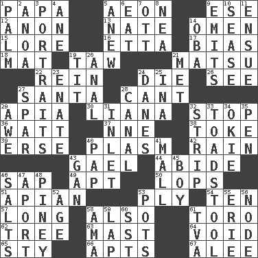 ACROSS 1. Dad 5. A really long time 9. Compass dir. 12. Soon (poet.) 13. Nathan's nickname 14. Presage 15. Old wives' tales, e.g. 16. Singer James 17. Prejudice 18. Floor covering 19. The 23rd letter of the Hebrew alphabet 21. Taiwanese island in East China Sea 22. It's straight from the horse's mouth 24. Pass on 26. Perceive with the eye 27. Before Barbara or Clara 28. Patter 29. Capital of Western Samoa 30. Woody, climbing, usually tropical plant 32. Close up, plug up 36. Electrical Unit 37. Compass dir. 38. Casino tip 39. Celtic language 40. Suffix with ecto or cyto 42. Precipitation 43. Highlander 44. Stay 46. Plant excrement 49. Fitting 50. Chops off 51. Bee-related 53. Travel a route regularly 54. "___ Little Indians" 57. Having great length 58. In addition 61. "Corrida" creature 62. Relationship diagram 63. Vertical spar for supporting sails 64. State of nonexistence 65. Filthy place 66. Flats, for short 67. Toward shelter DOWN 1. Inside of hand 2. Small Philippine buffalo 3. Likenesses of persons 4. One (Scot) 5. Afresh 6. Ingest 7. Baseball player Mel 8. Teachers' org. 9. Sends forth 10. Gospel singer Marvin 11. Take place subsequently 14. Chief or king in Benin or Nigeria 19. Teat (slang) 20. Of or related to the anus 21. Was introduced to 23. Maternal 24. Natives or inhabitants of Denmark 25. _ tizzy (2 wds.) 27. Coast Guard woman 28. Lessep's creation 29. Deep reverence 31. An arm off of a larger body of water 32. Remove all contents or possession from 33. Inedible or poisonous agaric 34. Migrant worker of the '30s 35. Fenced enclosure 40. Infant food 41. Promenade 43. Separate the seeds from cotton 45. Male child 46. Table seasonings 47. To the left, to Queeg 48. Abounding in pines 52. Mature 53. Cooking vessels 55. 4th largest of the Great Lakes 56. Thickened enlargement 58. Nursemaid (var.) 59. Pet locale 60. Fast jet (abbr.) 61. Federal power corp.