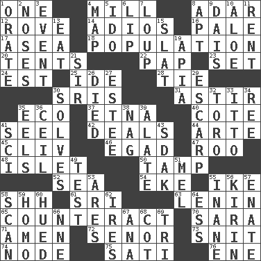 ACROSS 1. Single 4. Place where flour is made 8. The sixth month of the Jewish calendar 12. Be footloose 14. Goodbye (Sp.) 16. Light colored 17. At sea 18. Census information 20. Portable shelters 22. Infant food 23. Put into a specified state 24. Eastern Standard Time (abbr.) 25. Binary compound 28. Standoff 30. Indian titles of respect 31. Moving or stirring 35. Environmental prefix 37. Inactive volcano in Sicily 40. ____ d'Azur (French Riviera) 41. Stitch closed the eyes of (a falcon) 42. Allots cards 44. Johnson of "Laugh-In" 45. 154 in Roman numerals 46. Mild oath 47. Friend of Pooh 48. Small island 50. Pack (down) 52. Ocean 54. Supplement with great effort 55. Mamie's husband 58. Quiet! 61. _ Lanka 63. Soviet premier 1918-24 65. Neutralize 70. "Two Mules for Sister ____" 71. So be it 72. Sir (Sp.) 73. In a ____ (agitated or irritated) 74. Connecting point 75. Suttee (variant) 76. Compass dir. DOWN 1. Speak pompously 2. Olfactory organs 3. Incident 4. Atlas unit 5. Wedding promise 6. Mouth edge 7. Central Nebraska county 8. Fitting 9. Raised platform 10. _ vera 11. Monthly bill 13. Ingest 15. Narrow board 19. Capital of Western Samoa 21. Title for a knight 26. Passed on 27. First name in cosmetics 29. Fortification 30. Finds the solution 32. "Corrida" creature 33. "Tell ____ the Marines!" 34. Portuguese money of account (variant) 35. Snakelike fish 36. To provide with a ceiling 38. Tired old horse 39. Having winglike extensions 41. _-fi 43. Neighbor of Neb. 49. Trial 51. Cartoonist voice _ Blanc 53. Ancient Greek god of war 55. Lacking in sense or substance 56. Japanese brewing company 57. Maternal 58. Examine hastily 59. Like (prefix) 60. Took on color 62. Angers 64. Curvy letter 66. Compass dir. 67. Santa ___, CA 68. Small bed 69. Three (prefix)