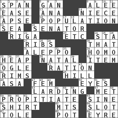ACROSS 1. Connect, as a bridge 5. Separate the seeds from cotton 8. Toward shelter 12. Relaxation 13. Santa ___, CA 14. Sibling's daughter 15. Domed church section 16. Census information 19. Ocean 20. Legislator 21. Port city in Latvia 23. And so on (abbr.) 24. R.R. building 27. Teases 30. Not this but _ 31. City in Syria 34. Like (prefix) 35. Pile 38. Brizilian seaport 40. Detail 41. Stare at amorously 42. Food allowance for one day 44. Basketball hoops 45. Land elevation 46. White ___ sheet 47. Opposite of masc. 50. Sight organs 53. Preparing or cooking with lard 57. Was introduced to 59. Appease 63. Trig term 64. Chest covering 65. Mountains (abbr.) 66. Narrow, elongated depression 67. Lacquered or enameled metalware 68. Plant holder 69. Jane of fiction DOWN 1. Oceans 2. Some stationery 3. Slender Brazilian palm 4. Born 5. Yawn 6. Soon (poet.) 7. California wine valley 8. Small island 9. Luau accessory 10. Environmental prefix 11. Car or cant ending 14. Drug cop 17. Shoshoni 18. Car dealer's back yard 20. Move on water 22. Raisin fruits 24. Went for two points 25. Not wild 26. Tiny particle 28. Benjamin's nick name 29. Practice fight 30. Without thickness 32. Parent Teacher Assoc. 33. Pledge 35. Israeli folk dance 36. Armor plate that protects the chest 37. _ mater 39. Cards in a Roman deck? 43. Cassini of fashion 47. Sudden quick movement 48. Erode 49. Medical imaging device (abbr.) 51. Poet Dickinson 52. Sir (Sp.) 54. Moist 55. "Tell ____ the Marines!" 56. Egg locale 58. Wig 59. Pacific Standard Time (abbr.) 60. 17th letter of the Greek alphabet 61. Petroleum 62. Before (prefix) 63. Compass dir.