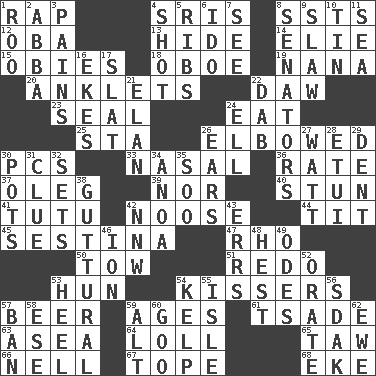 ACROSS 1. Strike 4. Indian titles of respect 8. Fast planes 12. Chief or king in Benin or Nigeria 13. Flintstone garb 14. Writer Wiesel 15. Off-Broadway awards 18. Mitch Miller's instrument 19. Grandmother 20. Short socks 22. Fool 23. Lick closed 24. Erode 25. R.R. building 26. Shoved, as through a crowd 30. Personal Computers (abbr.) 33. Relating to the nose 36. Pace 37. Cassini of fashion 39. And not 40. Surprise greatly 41. Ballerina skirt 42. Trap for birds or small mammals 44. Teat (slang) 45. French poetic form 47. 17th letter of the Greek alphabet 50. Pull behind 51. Do over again 53. Attila the _ 54. Smoochers 57. Fermented drink made from hops 59. Grows older 61. Sadhe (variant) 63. Toward the sea 64. Hang loosely or laxly 65. The 23rd letter of the Hebrew alphabet 66. 1994 drama film starring Jodie Foster 67. Drink excessively 68. Supplement with great effort DOWN 1. Friend of Pooh 2. Swedish rock group 3. Aches 4. Went for two points 5. Teases 6. Wedding promise 7. Perceive with the eye 8. Elected representatives 9. Cole _ (cabbage dish) 10. Shallow baking pan 11. Ocean 16. Makes supply last 17. Narrow board 21. Style 22. Small moist lump or mass 24. Pipe bend 26. Hearing organs 27. Electrical Unit 28. Needle case 29. Undesirable depression on a surface 30. Cooking vessels 31. A slight indication 32. Puts into a specified state 34. Small Philippine buffalo 35. "Barney Miller" actor Jack 38. From the throat 42. Compass dir. 43. Blunders 46. Electrically charged atom 48. Behest 49. Lyric poems 52. Speak pompously 53. The bottom of a shoe or boot 54. Seaweed 55. Capri or Wight 56. Neighbor of Neb. 57. Forbid 58. Compass dir. 59. The first octave above the treble staff 60. Thick or sticky substance 62. She-sheep