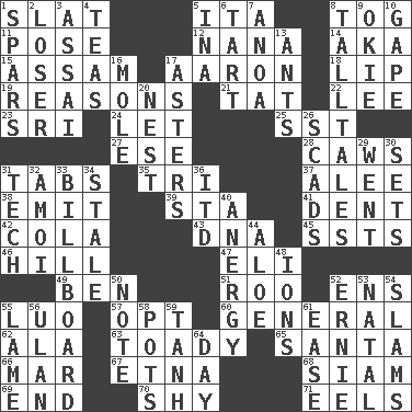 ACROSS 1. Narrow board 5. Call ___ day 8. Coat; cloak 11. Airs 12. Nanny 14. Alias (abbr.) 15. Indian state 17. Composer Copland 18. Mouth edge 19. Thinks logically 21. Make lace 22. Area sheltered from the wind 23. Indian title of respect (Mr.) 24. Allow 25. Fast jet (abbr.) 27. Compass dir. 28. Crow sounds 31. Bar bills 35. Three (prefix) 37. Toward shelter 38. Send forth 39. R.R. building 41. Undesirable depression on a surface 42. Root beer relative 43. Heredity factor (abbr.) 45. Fast planes 46. Land elevation 47. Biblical high priest 49. Benjamin's nick name 51. Friend of Pooh 52. Followers of ems 55. Nilotic language 57. Choose 60. Commissioned military rank 62. Chicken ___ king 63. Sycophant 65. Before Barbara or Clara 66. Spoil 67. Inactive volcano in Sicily 68. Thailand, formerly 69. Conclusion 70. Like a shrinking violet 71. Snakelike fish DOWN 1. Practice fights 2. Failure 3. Slender Brazilian palm 4. Afternoon social gatherings 5. _ tizzy (2 wds.) 6. Small pie 7. Small Philippine buffalo 8. Baron Munchausen's specialties 9. Migrant worker of the '30s 10. Stare wonderingly 13. Pismires 16. Undercover agent 17. Michaelmas daisies 20. Egg locale 26. Oodles 29. Gone 30. Arranges properly for use 31. Technical 32. Mine, in Marseilles 33. Big road sign 34. Lacking originality or spontaneity 36. It would 40. Disorder of the immune system 44. Medicinal plant 48. Charged particles 50. Make mention of 52. Bert's buddy 53. Relating to or accompanying birth 54. Hits or strikes with great force 55. Unable to walk 56. Uhlan (variant) 58. Cooking vessels 59. Hyperbolic tangent 61. Comfort 64. 24 hours
