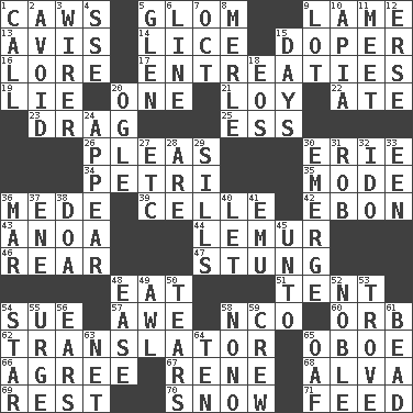 ACROSS 1. Crow sounds 5. Take by theft 9. Unable to walk 13. Deliberation 14. Louse (plural) 15. Drug addict 16. Old wives' tales, e.g. 17. Pleas 19. Whopper 20. Single 21. Myrna of the movies 22. Had dinner 23. To trail on the ground 25. Curvy letter 26. Entreaties 30. One of the Great Lakes 34. _ dish (used to culture cells) 35. Method 36. Ancient Persian 39. Cell (Danish) 42. Inky black, to poets 43. Small Philippine buffalo 44. Arboreal primate 46. Located in or toward the back 47. Feeling sharp psychological pain 48. Consume 51. Portable shelter 54. Take to court 57. Deep reverence 58. Non-commissioned officer (abbr.) 60. Globe 62. Interpreter 65. Mitch Miller's instrument 66. Match 67. French philosopher Descartes 68. Inventor's middle name 69. State of inaction 70. Overwhelm 71. Nourish DOWN 1. Give a ring to 2. Prevent from happening 3. One who wires 4. Compass dir. 5. Small, secluded valley 6. Actor's bit 7. Sep. follower 8. Haggard of country music 9. Car dealer's back yard 10. Capital of Western Samoa 11. Confront 12. Celtic language 15. 24-hour periods 18. Greek goddess of the dawn 20. Stare 24. Become visible 27. And so on (abbr.) 28. "We ___ not amused" (Victoria) 29. Beverly of Met fame 30. Develop 31. Director Reiner 32. Wedding promise 33. Car or cant ending 36. Impair 37. Compass dir. 38. ___ good deed 40. Allow 41. Australian flightless bird 45. To (old English) 48. Relaxation 49. Leather borer 50. Pulls into pieces 52. Impressive in appearance 53. Collection of objects 54. Play the lead 55. Goad 56. Hearing organs 58. Words to Nanette 59. Ship's personnel 61. Necklace unit 63. Remaining after all deductions 64. "___ Little Indians" 65. Clumsy lout