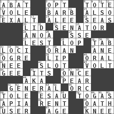ACROSS 1. Blind as ____ 5. Elect 8. Lug 12. Grand slam 13. Sharp remark 15. In addition 16. Glorify 18. Toward shelter 19. Oceans 20. Hat (slang) 22. Legislator 24. Small Philippine buffalo 26. Compass dir. 27. For fear that 28. Trim (branches) 29. Bar bill 32. Event scenes 35. NW Algerian seaport 37. A saturated hydrocarbon 38. Legendary monster 39. Mouth edge 40. Spoken 41. Born 42. Position in a hierarchy or organization 43. Electrical Unit 44. Turn to the right 45. It is 46. At one time in the past 49. Alias (abbr.) 50. Lightbulb-shaped fruit 51. Commissioned military rank 55. The grampus (Milton) 56. Lacquered or enameled metalware 57. He sold his birthright 59. Ancient Roman robes 63. Capital of Western Samoa 64. Monthly bill 65. Pledge 66. One who makes use of a thing 67. Ripen 68. Leg joint DOWN 1. "___ Maria" 2. Gift holder 3. Chicken ___ king 4. Copy Pinocchio 5. Chief or king in Benin or Nigeria 6. Friends 7. Family _ (genealogy) 8. Clothes sense 9. Margarine 10. Russian ruler of old 11. Greek goddess of the dawn 14. Gillaume's butler role 17. Prong on a fork 21. Two (Sp.) 23. Cleo's killer 25. Ringlike coral islands and reefs 28. Portable computer 29. Edible starchy tuberous root 30. Of or related to the anus 31. Waist strap 32. Yearn 33. Double curve, resembling the letter S 34. Algonquian 36. _ de Janeiro 40. Burn the roast 42. A viewer who gazes fixedly 45. Mamie's husband 47. Modern: prefix 48. Draw slowly or heavily 49. Approach 51. Republicans 52. Writer Wiesel 53. At sea 54. Austrian-born American filmmaker Fritz 56. The 19th letter of the Greek alphabet 58. Shoshoni 60. Separate the seeds from cotton 61. Had dinner 62. A female animal or person