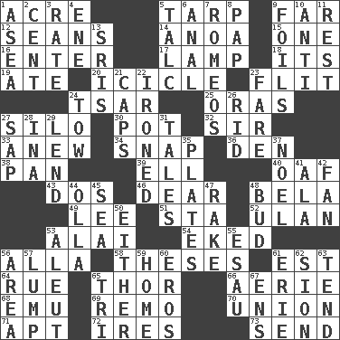 ACROSS 1. Land measure 5. Canvas cover 9. Distant 12. Seines 14. Small Philippine buffalo 15. Single 16. Keyboard key 17. Desk light 18. ___ a Wonderful Life 19. Had dinner 20. Hanging ice 23. Secret move to avoid paying debts 24. Russian ruler of old 25. Mouths or openings 27. Grain storage tower 30. Plant holder 32. Title for a knight 33. Afresh 34. Fastener 36. Lair 38. Baking dish 39. Pipe bend 40. Clumsy lout 43. Two (Sp.) 46. Letter starter 48. Actor Lugosi 49. Area sheltered from the wind 51. R.R. building 52. Uhlan (variant) 53. Jai ____ 54. Supplemented with great effort 56. Silent film actress Nazimova 58. College papers 61. Eastern Standard Time (abbr.) 64. Sorrow 65. Son of Odin 66. Nest on high 68. Australian flightless bird 69. San ____ (Riviera town) 70. The state of being joined or united 71. Fitting 72. Angers 73. Transmit DOWN 1. At sea 2. Penny 3. Assign a rank or rating to 4. Compass dir. 5. Baby powder 6. Of or related to the anus 7. Lover boys 8. Infant food 9. Fencing necessities 10. Against 11. State of inaction 13. Indian titles of respect 21. Smile enhancers 22. Pressed 23. Conductor's collection 24. Pull behind 26. To free from 27. Plant excrement 28. _ tizzy (2 wds.) 29. Grant temporary use of 31. Stories 35. Food holders 37. Christmas carol 41. Insect wing 42. Avid follower 44. Rounded earthenware pot or jar 45. Ocean 47. Libertine 48. Partially opened flower 50. One or the other of two 53. Eskimo relative 55. He sold his birthright 56. Type of rug 57. Mass 59. Dwelling 60. Greek god of love 61. One of the Great Lakes 62. The Jewish people; Israel 63. Be inclined (to) 65. Three (prefix) 67. Followers of ems