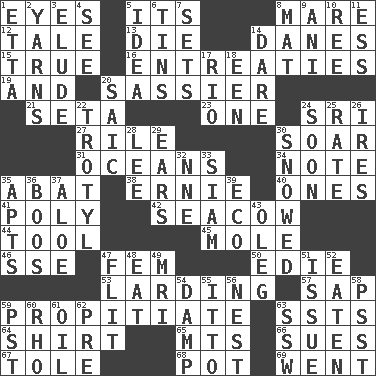 ACROSS 1. Sight organs 5. It is 8. Female horse 12. Lie 13. Expire 14. Natives or inhabitants of Denmark 15. Loyal 16. Pleas 19. Added to 20. More impudent 21. Stalk of a moss capsule 23. Single 24. Indian title of respect (Mr.) 27. Cause heat under the collar 30. Fly high 31. Seas 34. Make mention of 35. Blind as ____ 38. Bert's buddy 40. Singles 41. Many (prefix) 42. Manatee 44. Instrument 45. Undercover agent 46. Compass dir. 47. Opposite of masc. 50. Singer Brickell 53. Preparing or cooking with lard 57. Plant excrement 59. Conciliate 63. Fast planes 64. Upper-body garment 65. Mountains (abbr.) 66. Takes to court 67. Lacquered or enameled metalware 68. Plant holder 69. Gone DOWN 1. Singer James 2. Entertaining tales 3. Evade 4. Perceive with the eye 5. The content of cognition 6. Metal containers 7. Arranges properly for use 8. Floor protector 9. Cuckoo 10. To separate or throw off 11. Double-curved letter 14. Have the gumption 17. River (Sp.) 18. Car or cant ending 20. Ketch in the Levant 22. Trinitrotoluene 24. Within a short period 25. Assign a rank or rating to 26. Angers 28. Area sheltered from the wind 29. Hearing organs 30. Frozen precipiation fell 32. Compass dir. 33. Thailand, formerly 35. Tenement units (abbr.) 36. Expressions of contempt or scorn 37. _ vera 39. Environmental prefix 43. Cassini of fashion 47. Secret move to avoid paying debts 48. Erode 49. Medical imaging device (abbr.) 51. Come out of 52. Consumed 54. Moist 55. "Tell ____ the Marines!" 56. Egg locale 58. Inconspicuous attention getter 59. Pacific Standard Time (abbr.) 60. 17th letter of the Greek alphabet 61. Lubricate 62. Before (prefix) 63. Compass dir.
