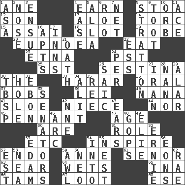 ACROSS 1. One (Scot) 4. Merit 8. Portico 12. Boy, to dad 13. Medicinal plant 14. Torque (variant) 15. Slender Brazilian palm 18. Position in a hierarchy or organization 19. Loose flowing garment 20. Normal relaxed breathing 22. Ingest 23. Inactive volcano in Sicily 24. Pacific Standard Time (abbr.) 25. Fast jet (abbr.) 26. French poetic form 30. Definite Article 33. Ethiopian city, capital of Harari 36. Of the mouth 37. Moves up and down 39. Flowery wreath 40. Nanny 41. A type of plum 42. Sibling's daughter 44. Not either 45. Pre-World Series prize 47. Personal question 50. "We ___ not amused" (Victoria) 51. Hero or heavy, e.g. 53. And so on (abbr.) 54. Stimulate to action 57. Inside; within (prefix) 59. Singer Murray 61. Sir (Sp.) 63. Burn superficially 64. Soaks 65. _ tizzy (2 wds.) 66. Scottish caps 67. Plunder 68. Compass dir. DOWN 1. White ___ sheet 2. Olfactory organ 3. Follow as a consequence or result 4. Comfort 5. Silent film actress Nazimova 6. Friend of Pooh 7. Remaining after all deductions 8. Ski resort town in Vermont 9. A blast of a horn 10. Globe 11. Adept person 16. Flats, for short 17. Taverns 21. Pledge 22. Double-curved letter 24. For each 26. Ketch in the Levant 27. SW Asia republic 28. Billionth: prefix 29. Having or resembling wings 30. Cook's measure (abbr.) 31. Hollow 32. Inky black, to poets 34. Set down 35. To separate or throw off 38. Elected representatives 42. Compass dir. 43. Hearing organs 46. Curve 48. Republicans 49. Writer Wiesel 52. Bert's buddy 53. Dutch treat 54. To the inside or interior of 55. A home for chicks 56. Immeasurably long periods of time 57. Eastern Standard Time (abbr.) 58. Teachers' org. 59. Leather borer 60. Modern: prefix 62. Actress Charlotte