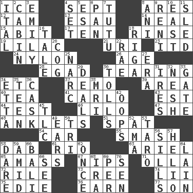 ACROSS 1. Frozen water 4. Back-to-school mo. 8. Ancient Greek god of war 12. Scottish cap 13. Son of Isaac 14. Actress Patricia 15. "This won't hurt ____!" 17. Portable shelter 18. Wash lightly 19. Pale purple color 21. RI univ. 23. It would 24. High-strength synthetic material 26. Grow older 28. Mild oath 30. Rending 34. And so on (abbr.) 37. San ____ (Riviera town) 39. Length times width 40. Afternoon social gathering 41. Monte _, Las Vegas Hotel/Casino 43. Eastern Standard Time (abbr.) 44. Trial 46. _ and Stitch 47. A female animal or person 48. Short socks 51. Petty quarrel 54. Automobile 55. Box-office sellout 58. Apply (a substance) by light strokes 61. _ de Janeiro 63. Satellite of Uranus 65. Collect or gather 67. Pinches, bites 71. Spanish pot 72. Cause heat under the collar 73. Algonquian 74. Cards in a Roman deck? 75. Singer Brickell 76. Merit 77. Male offspring DOWN 1. Slanted text style (abbr.) 2. Small house or cottage 3. Poet Dickinson 4. Arrange properly for use 5. Compass dir. 6. Baking dish 7. Ballerina skirt 8. Black tropical American cuckoo 9. Painter Guido (1575-1642) 10. Compass direction 11. Downhill vehicle 16. Story 18. Port city in Latvia 20. Gear tooth 22. Actress Charlotte 25. Drug cop 27. Epoch 29. Allots cards 30. For Whom the Bell _____ 31. Angers 32. Tender 33. Yard entry 34. Singer James 35. Adolescent 36. Keg 38. Medical imaging device (abbr.) 42. I made a mistake 45. Affectionate concern, for short 49. Hearing organs 50. Three (prefix) 52. Housemaid (var.) 53. Edible starchy tuberous root 56. Beverly of Met fame 57. Sun: prefix 58. Have the gumption 59. Among 60. Indonesian resort city 62. At one time in the past 64. (Had) reclined 66. Observe 68. Retirement account (abbr.) 69. For each 70. Elected rep.