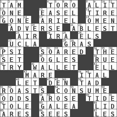 ACROSS 1. Scottish cap 4. "Corrida" creature 8. Set down 12. Single 13. Artist's stand 14. Become fatigued 15. Went 17. Satellite of Uranus 18. Presage 19. Contrary to your interests or welfare 21. Most capable 23. Wind 24. Retirement account (abbr.) 26. Raised railways 27. Southern CA. univ. 28. Pate de foie ____ 30. Air pressure measure (abbr.) 31. Flew 34. Definite Article 37. Put into a specified state 38. Stares 39. Regret 40. Attempt to accomplish something 41. Place for singles 42. Pipe bend 43. Female horse 44. Slanted text style (abbr.) 46. Allow 47. Lair 50. Small amount or degree 51. Exposes to great heat 54. Ingest 57. Likelihood 58. Came up 60. Periodic rise and fall of the sea level 62. Lacquered or enameled metalware 63. An organ shaped like a helmet 64. Flaplike covering 65. Ancient Greek god of war 66. Observes 67. French article DOWN 1. Coat; cloak 2. Small Philippine buffalo 3. Ananias' fault 4. Tarsus (plural) 5. Flexible twig of a willow tree 6. To sift 7. Spanish pot 8. Ringlike coral islands and reefs 9. Citrus fruits 10. Angers 11. Portable shelter 13. Ewer handle 16. Morally bad or wrong 20. Period 22. Necklace unit 25. Match 27. One who makes use of a thing 29. Repose 30. Pacific Standard Time (abbr.) 31. Fly high 32. Stared at amorously 33. Everything 34. Excercise machine 35. Frame or body of a ship 36. Snakelike fish 41. Electrical Unit 43. Makes clutter 44. It is 45. Tense 46. Dipping utensil 48. Learning spot: Fr. 49. Olfactory organs 51. Round or rotation of duties 52. Scent 53. Droops 55. Teachers' org. 56. Singer Brickell 59. Actress Charlotte 61. Begley and Asner