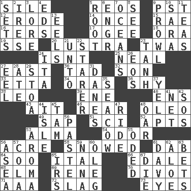 ACROSS 1. Filth; sediment 5. Vintage cars 9. Pacific Standard Time (abbr.) 12. Wear away 14. Single time 15. Actress Charlotte 16. Laconic 17. Double curve, resembling the letter S 18. Mouth or opening 19. Compass dir. 20. A period of five years 23. It was, poetically 24. Is not 25. Actress Patricia 27. 90 degrees 30. Bit 32. Male child 33. Singer James 34. Mouths or openings 36. Like a shrinking violet 38. Lion 39. Compass dir. 40. Followers of ems 43. Small island 46. Stern 48. Butter sub 49. Plant excrement 51. _-fi 52. Flats, for short 53. _ mater 54. Scent 56. 43,560 square feet 58. Overwhelmed 61. Apply (a substance) by light strokes 64. "Barney Miller" actor Jack 65. Slanted text style (abbr.) 66. Peak District village in England 68. Shade tree 69. French philosopher Descartes 70. A piece of turf (Scot.) 71. American Automobile Association (abbr.) 72. Volcanic refuse 73. Sight organs DOWN 1. Arranges properly for use 2. Angers 3. Old wives' tales, e.g. 4. Begley and Asner 5. Carrot, for example 6. Engineer (abbr.) 7. Seas 8. Perceive with the eye 9. Move like a hungry wolf 10. "Two Mules for Sister ____" 11. Beverages made from leaves 13. Snakelike fish 21. To (old English) 22. A viewer who gazes fixedly 23. Hyperbolic tangent 24. Call ___ day 26. Greek goddess of the dawn 27. Snakelike fish 28. Had dinner 29. Portico 31. Natives or inhabitants of Denmark 35. Manatee 37. Sharp bark 41. Fish or hair follower 42. Mayday 44. Small island 45. Scottish cap 47. Travel on or in a vehicle 48. Rowing implement 50. Soft color 53. Odor 55. Wrote a lyric poem 56. Toward the sea 57. Root beer relative 59. Nanny 60. Cassini of fashion 61. American folk hero Crockett 62. _ vera 63. Stakes 65. Big collection agency 67. Expire