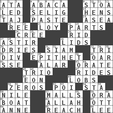 ACROSS 1. _ moment's notice (2 wds.) 4. Phillipine bananalike plant 9. Portico 13. Directed 14. Major League Baseball Commissioner Bud 15. Coop moms 16. _ Mahal 17. Thick mixture 18. At sea 19. To sift 21. Myrna of the movies 22. Actors' quests 24. Algonquian 26. To free from 27. Moving or stirring 29. Flaplike coverings 30. Frees from moisture 31. Thailand, formerly 33. Three (prefix) 36. HTML Container Element 37. Curse 40. Boat paddle 41. Compass dir. 42. Having or resembling wings 43. Speak pompously 45. Musical group of three 47. Amusement-park features 48. A really long time 49. Tennis shots 50. Nothings 52. Luau course 54. R.R. building 56. The longest river in the world 57. Promenades 59. Mouth or opening 61. Water vessel 62. Assad's deity 63. Baseball player Mel 64. Queen of England 1702-14 65. Arrive at 66. Area sheltered from the wind DOWN 1. Keyboard modifier key 2. Pull apart 3. Descriptive word 4. Cleo's killer 5. Memphis, Tenn. Street 6. In addition 7. Municipality 8. Personal question 9. Broken pieces 10. Trial 11. Washington bills 12. White ___ sheet 20. 4th largest of the Great Lakes 22. First class 23. Help 25. Celtic language 27. Does sums 28. Indian titles of respect 29. Cowardly lion portrayer 31. Grain storage tower 32. Call ___ day 33. Inedible or poisonous agaric 34. Assign a rank or rating to 35. Angers 38. Aches 39. "Corrida" creature 44. Teases 45. Cigar-shaped 46. Friend of Pooh 49. Pale purple color 50. The Jewish people; Israel 51. Liveliness 52. Diluted with white 53. Water jar 55. Johnson of "Laugh-In" 56. Basketball assoc. 57. Spoil 58. Quiet! 60. Had dinner