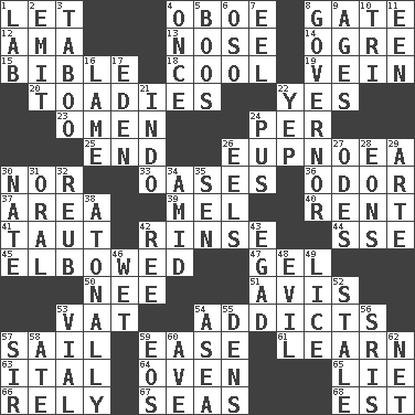ACROSS 1. Allow 4. Mitch Miller's instrument 8. Yard entry 12. Wet nurse (var.) 13. Sense of smell 14. Legendary monster 15. The Good Book 18. Calm and collected 19. Distinctive style or manner 20. Sycophants 22. It is so 23. Sign of things to come 24. For each 25. Conclude 26. Normal relaxed breathing 30. Not either 33. Fertile tracts in a desert 36. Aroma 37. Length times width 39. Cartoonist voice _ Blanc 40. Monthly bill 41. Pulled tight 42. Wash lightly 44. Compass dir. 45. Shoved, as through a crowd 47. Set 50. Born 51. Deliberation 53. Large container 54. Inveterate users 57. Move on water 59. Comfort 61. Memorize 63. Slanted text style (abbr.) 64. Baking chamber 65. Whopper 66. Trust 67. Oceans 68. Eastern Standard Time (abbr.) DOWN 1. Experiment locale 2. Give off 3. Off limits 4. Single time 5. Scornful sounds 6. Bear (Spanish) 7. Snakelike fish 8. Head of state? 9. Ripens 10. Three (prefix) 11. Car or cant ending 16. Unable to walk 17. Locale of original sin 21. Southeast Asian peninsula 22. Slangy assent 24. Product of festering 26. Snakelike fish 27. Lyric poems 28. Immeasurably long periods of time 29. Johnson of "Laugh-In" 30. Nathan's nickname 31. Spoken 32. Reuben's nickname 34. Among 35. Elected rep. 38. Without tonality 42. To sift 43. Mild oath 46. Soggy 48. Tending to cause great harm 49. Louse (plural) 52. Having lost freshness 53. Small bottle 54. Toward the sea 55. Lairs 56. Indian titles of respect 57. Title for a knight 58. Had dinner 59. Greek goddess of the dawn 60. "___ Maria" 62. Remaining after all deductions