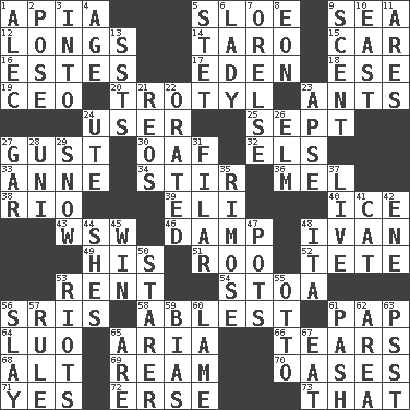 ACROSS 1. Capital of Western Samoa 5. _ gin 9. Ocean 12. Yearns 14. Edible starchy tuberous root 15. Automobile 16. _____ Park, CO 17. Genesis locale 18. Compass dir. 19. Corporate head (abbr.) 20. TNT 23. Pismires 24. One who makes use of a thing 25. Back-to-school mo. 27. Abrupt rush of wind 30. Clumsy lout 32. Raised railways 33. Singer Murray 34. Tumult 36. Cartoonist voice _ Blanc 38. River (Sp.) 39. Connecticut Ivy Leaguer 40. Frozen water 43. Compass dir. 46. Moist 48. _ the terrible 49. Part of HMS, perhaps 51. Friend of Pooh 52. False hair 53. Monthly bill 54. Portico 56. Indian titles of respect 58. Most capable 61. Infant food 64. Nilotic language 65. Roberta Peters solo 66. Pulls apart 68. Keyboard modifier key 69. 480, 500 or 516 sheets of paper 70. Fertile tracts in a desert 71. Consenting reply 72. Celtic language 73. Not this but _ DOWN 1. Actor Baldwin 2. Airs 3. To the inside or interior of 4. Personal question 5. Proofreading order 6. Kenny Rogers chart-topper in '80 7. Threatening words 8. Period of immesurable duration 9. Odor 10. 90 degrees 11. Ancient Greek god of war 13. Fast planes 21. Vintage cars 22. Declaimed 23. Domed church section 24. Shoshoni 26. Shade tree 27. Slender fish 28. Single; one (prefix) 29. Overwhelm 31. Of or pertaining to a thread or threads 35. Full of chinks, cracks, or crevices 37. Not recorded 41. Domesticated feline 42. Compass dir. 44. "______ My Girl" (Turtles hit) 45. Acquire through effort 47. Plant holders 48. Call ___ day 50. A viewer who gazes fixedly 53. Debaucheries 55. Von Bismarck 56. Kill 57. General guideline 59. Prejudice 60. Unable to walk 61. Romantic infatuation 62. Type of rug 63. Inconspicuous attention getter 65. "We ___ not amused" (Victoria) 67. Consume