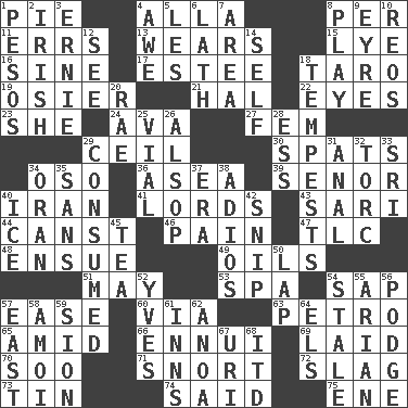 ACROSS 1. Sliced dessert 4. Silent film actress Nazimova 8. For each 11. Blunders 13. Erodes 15. Sodium hydroxide 16. Trig term 17. First name in cosmetics 18. Edible starchy tuberous root 19. Flexible twig of a willow tree 21. Actor Linden 22. Snake ____ (dice throw) 23. A female animal or person 24. Actress Gardner 27. Opposite of masc. 29. To provide with a ceiling 30. Arguments over trivial matters 34. Bear (Spanish) 36. At sea 39. Sir (Sp.) 40. SW Asia republic 41. Titled peers of a realm 43. Indian skirt 44. 2nd pers. sing. pres. of can (arch.) 46. Ache 47. Affectionate concern, for short 48. Take place subsequently 49. Petroleums 51. Can I? 53. Health resort 54. Plant excrement 57. Comfort 60. By way of 63. Stone: prefix 65. Among 66. World-weariness 69. Put down 70. "Barney Miller" actor Jack 71. Derisive sound 72. Volcanic refuse 73. Metal container 74. Alleged 75. Compass dir. DOWN 1. Mexican monetary units 2. From or relating to Ireland 3. Bert's buddy 4. Deep reverence 5. French article 6. Thin strip of wood or metal 7. Length times width 8. Shaw product 9. Jane of fiction 10. Vintage cars 12. Perceive with the eye 14. Automatic 18. Storms 20. Actress Charlotte 25. Small bottle 26. Columnist Joseph or Stewart 28. Double-curved letter 29. Eaten 31. Of or related to the anus 32. Torque (variant) 33. Indian title of respect (Mr.) 34. Northwest Algerian city 35. Without 37. Epoch 38. Goodbye (Sp.) 40. Frozen water 42. Sever or remove by pinching or nipping 45. Afternoon social gathering 50. Pet locale 52. Jacques Cousteau's middle name 54. Having lost freshness 55. Believer in; advocate of (suffix) 56. Plash 57. Compass direction 58. Mine, in Marseilles 59. The Jewish people; Israel 61. Lodging establishments 62. Small Philippine buffalo 64. Raised railways 67. RI univ. 68. It would