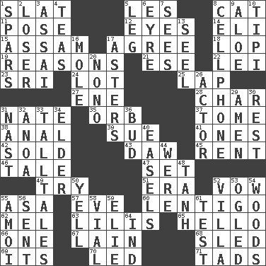 ACROSS 1. Narrow board 5. French article 8. Domesticated feline 11. Introduce or present, as a question 12. Sight organs 14. Biblical high priest 15. Indian state 17. Match 18. Trim (branches) 19. Thinks logically 21. Compass dir. 22. Flowery wreath 23. _ Lanka 24. Car dealer's back yard 25. Infant locale 27. Compass dir. 28. Burn to charcoal 31. Nathan's nickname 35. Globe 37. Heavy book 38. Of or related to the anus 39. Take to court 41. Washington bills 42. Exchanged or delivered for money 43. Fool 45. Monthly bill 46. Lie 47. Arrange properly for use 49. Attempt to accomplish something 51. Period 52. Solemn pledge 55. White ___ sheet 57. First lady 60. Small, flat, pigmented spot on the skin 62. Cartoonist voice _ Blanc 63. Ms. Damita and namesakes 65. Phone greeting 66. Single 67. (Had) reclined 68. Downhill vehicle 69. It is 70. Directed 71. Small amounts or degrees DOWN 1. Practice fights 2. Failure 3. Slender Brazilian palm 4. Afternoon social gatherings 5. Part of a journey 6. Jane of fiction 7. Observes 8. Portable communications device 9. _ vera 10. Native american tent (variation) 13. Sew up the eyelids of hawks and falcons 16. Undercover agent 17. Michaelmas daisies 20. Words to Nanette 26. Thespian 29. So be it 30. Remainder 31. Political cartoonist Thomas 32. Small Philippine buffalo 33. Baron Munchausen's specialties 34. A person who is older than you are 36. Partially opened flower 40. Artist's stands 44. Past tense of be (plural) 48. Hyperbolic tangent 50. Shout 52. Country estate 53. Stared at amorously 54. Forest 55. Mine, in Marseilles 56. Transmitted 58. Small bottle 59. Writer Wiesel 61. Trial 64. Indiana (abbr.)