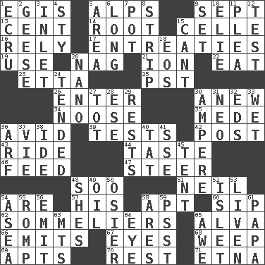 ACROSS 1. Armor plate that protects the chest 5. High mountains 9. Back-to-school mo. 13. Penny 14. Carrot, for example 15. Cell (Danish) 16. Have confidence or faith in 17. Pleas 19. Purpose 20. Tired old horse 21. Electrically charged atom 22. Consume 23. Singer James 25. Pacific Standard Time (abbr.) 26. Keyboard key 30. Afresh 34. Trap for birds or small mammals 35. Ancient Persian 36. Enthusiastic 39. Trials 42. Mail 43. Travel on an animal 44. Clothes sense 46. Nourish 47. Guide 48. "Barney Miller" actor Jack 51. Famous astronaut Armstrong 54. "We ___ not amused" (Victoria) 57. Part of HMS, perhaps 58. Fitting 60. Small drink 62. Wine waiters 65. Inventor's middle name 66. Sends forth 67. Sight organs 68. Shed a tear 69. Flats, for short 70. Repose 71. Inactive volcano in Sicily DOWN 1. Shade of tan 2. Honkers 3. An arm off of a larger body of water 4. Filthy place 5. Length times width 6. Having great length 7. Cooking vessel 8. Remove all contents or possession from 9. Put into a specified state 10. Writer Wiesel 11. Entreaty 12. Trial 15. Patter 18. Greek goddess of the dawn 20. Billionth: prefix 24. Watched over 27. Small child 28. Compass dir. 29. Musical pauses 30. Electrical Unit 31. Modern: prefix 32. Begley and Asner 33. Soggy 36. Sandy's bark 37. Compete 38. Binary compound 40. Make lace 41. Compass dir. 45. Portable shelter 48. "______ My Girl" (Turtles hit) 49. Petroleum 50. Flexible twig of a willow tree 52. Small island 53. Make or become more lively 54. At sea 55. Frolic 56. Send forth 58. Ancient Greek god of war 59. Inconspicuous attention getter 61. Dad 63. Mountains (abbr.) 64. Sight organ 65. Deep reverence