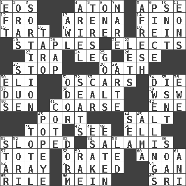 ACROSS 1. Greek goddess of the dawn 4. Smallest unit of an element 8. Domed church section 12. Away 13. Sports stadium 14. Fine (Spanish) 15. Small pie 17. One who wires 18. It's straight from the horse's mouth 19. Paper fasteners 21. Chooses 23. Lyricist Gershwin 24. Part of a journey 26. Compass dir. 27. Constrict 28. Pledge 30. Connecticut Ivy Leaguer 31. Motion picture awards 34. Pass on 37. Superhero pair 38. Started a card game 39. Compass dir. 40. Elected rep. 41. Unrefined 42. Compass dir. 43. Left side of a ship or aircraft 44. Table seasoning 46. Small child 47. Perceive with the eye 50. Pipe bend 51. Had an oblique or slanted direction 54. Deli grouping 57. Carry 58. Speak pompously 60. Small Philippine buffalo 62. Like ___ of sunshine 63. Swept the length of 64. Separate the seeds from cotton 65. Cause heat under the collar 66. Count _ (2 wds.) 67. Indian title of respect (Mr.) DOWN 1. Newt 2. Mouths or openings 3. Conclusion 4. Satellite of Uranus 5. Laconic 6. Single 7. Female horse 8. Anew 9. Component 10. In a ____ (agitated or irritated) 11. Immeasurably long periods of time 13. Leather borer 16. Pacific island yam 20. Infant food 22. Allows 25. Scores awarded for successful feats 27. Change direction abruptly 29. Johnson of "Laugh-In" 30. Begley and Asner 31. Aroma 32. Theater features 33. Auto 34. Homes 35. Is not 36. She-sheep 41. ____ d'Azur (French Riviera) 43. Wimpy's pal 44. Ocean 45. _ mater 46. "_____ Recall" 48. 1973 Nobel Price Winner (Physics) Leo 49. Consumed 51. Play the lead 52. Australian parrot (variant) 53. Dormintory (informal) 55. Directed 56. Fly high 59. Actress Charlotte 61. Cuckoo