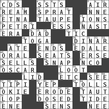 ACROSS 1. Music discs 4. Fast planes 8. Wind 11. 480, 500 or 516 sheets of paper 13. Small fatty European fish 15. Compass dir. 16. Inactive volcano in Sicily 17. Grayish beige 18. Charged atoms 19. _ dish (used to culture cells) 21. Double-curved letter 22. Political cartoonist Thomas 23. Epoch 24. Male parent 27. Nervous spasm 29. Ancient Roman robe 30. Middle Eastern gold or silver currency 34. Had dinner 36. Conclusions 39. Peak District village in England 40. Of the mouth 41. Theater features 43. Celtic language 44. Makes a sale 46. Fastener 47. Non-commissioned officer (abbr.) 48. Witty Wilde 49. Spoils 51. Flaplike covering 53. And so on (abbr.) 54. Observe 57. Native american tent (variation) 60. Slangy assent 63. For Whom the Bell _____ 65. Migrant worker of the '30s 66. Eat (away) 69. Pulled tight 70. Trim (branches) 71. Administered medicine 72. Event that recurs at intervals 73. Compass dir. 74. Elected reps. 75. Born DOWN 1. Streamer paper 2. Prevent from occurring 3. Before Barbara or Clara 4. Fast jet (abbr.) 5. Health resort 6. Loyal 7. Plant excrements 8. Small Philippine buffalo 9. Lodging establishments 10. State of inaction 12. Spoil 14. Trial 18. Event 20. Wedding promise 25. Grows older 26. Natives or inhabitants of Denmark 28. Binary compound 29. Copy Pinocchio 31. Drug cop 32. In addition 33. To riddle 34. Ancient Greek god of war 35. Baby powder 37. One of the 12 tribes of Israel 38. Lacking originality or spontaneity 40. Bear (Spanish) 42. Specific locale 45. _ Lanka 50. Sep. follower 52. Colored 54. Killed 55. Evade 56. First name in cosmetics 57. Lacquered or enameled metalware 58. Picture 59. Corncob 61. Greek god of love 62. Airs 64. Baseball player Mel 67. Lair 68. Begley and Asner