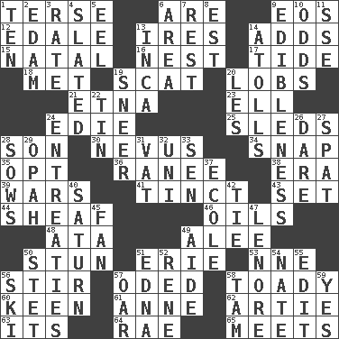 ACROSS 1. Laconic 6. "We ___ not amused" (Victoria) 9. Greek goddess of the dawn 12. Peak District village in England 13. Angers 14. Sums up 15. Relating to or accompanying birth 16. Egg locale 17. Periodic rise and fall of the sea level 18. Was introduced to 19. Leave at once 20. Tennis shots 21. Inactive volcano in Sicily 23. Pipe bend 24. Singer Brickell 25. Bobsleighs 28. Manchild 30. Congenital growth or mark on the skin 34. Fastener 35. Choose 36. The wife of a rajah (variant) 38. Period 39. Armed conflicts 41. Tinged 43. Put into a specified state 44. To gather and bind into a bundle 46. Lubricates 48. _ moment's notice (2 wds.) 49. Toward shelter 50. Surprise greatly 51. 4th largest of the Great Lakes 53. Compass dir. 56. Disorderly outburst 57. Wrote a lyric poem 58. Sycophant 60. Peachy ____! 61. Singer Murray 62. Nick name for Arthur 63. ___ a Wonderful Life 64. Actress Charlotte 65. Confronts DOWN 1. "___ Little Indians" 2. Dutch treat 3. Pace 4. Scheduled 5. Snakelike fish 6. Type of rug 7. Remainder 8. Eastern Standard Time (abbr.) 9. The property of being fit to eat 10. Likelihood 11. Compass dir. 13. South American Indian 14. Ringlike coral islands and reefs 19. Scornful expression 20. French article 22. Shallow baking pan 24. Pleas 26. Have the gumption 27. Argument over a trivial matter 28. Sty mamas 29. Brightly colored fish 31. Large container 32. Single; one (prefix) 33. Elected rep. 37. Learning spot: Fr. 40. Titan orbits this 42. Standoff 45. Avid follower 47. Poe poem 49. Helper 50. Proofreading order 51. Pulitzer Prize-winning author Ferber 52. French philosopher Descartes 54. Nathan's nickname 55. Prepare for publication 56. What Jean-Claude Killy likes to do 57. Boat paddle 58. Scottish cap 59. It is so
