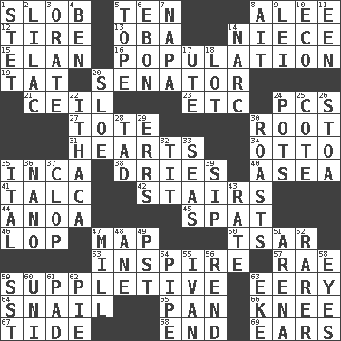 ACROSS 1. Messy guy 5. Nine, plus one 8. Toward shelter 12. Hoop that covers a wheel 13. Chief or king in Benin or Nigeria 14. Sibling's daughter 15. Style 16. Census information 19. Make lace 20. Elected representative 21. To provide with a ceiling 23. And so on (abbr.) 24. Personal Computers (abbr.) 27. Carry 30. Carrot, for example 31. Centers of feelings and intuitions 34. Von Bismarck 35. South American Indian 38. Frees from moisture 40. Toward the sea 41. Baby powder 42. Flight of steps 44. Small Philippine buffalo 45. Petty quarrel 46. Chop off 47. Atlas unit 50. Russian ruler of old 53. Heighten or intensify 57. Actress Charlotte 59. Supplementary 63. Suggestive of the supernatural 64. Slow-paced one 65. Baking dish 66. Leg joint 67. Periodic rise and fall of the sea level 68. Conclude 69. Hearing organs DOWN 1. Proofreading order 2. Pale purple color 3. Declaim 4. Benjamin's nick name 5. Drink excessively 6. Inky black, to poets 7. California wine valley 8. Small island 9. Luau accessory 10. Environmental prefix 11. Car or cant ending 14. Drug cop 17. Shoshoni 18. Car dealer's back yard 20. _ gin 22. New York city 24. Plant holders 25. ____ d'Azur (French Riviera) 26. Portico 28. Bit 29. Blunders 30. Exposes to great heat 32. Teat (slang) 33. Oceans 35. Slanted text style (abbr.) 36. Billionth: prefix 37. Hoof sound 39. Small drink 43. Pace 47. Place where flour is made 48. A saturated hydrocarbon 49. Pacific Standard Time (abbr.) 51. Sports stadium 52. Less widely known 54. Corncob 55. "Terrible" tsar 56. Tear apart 58. Snake ____ (dice throw) 59. Fast jet (abbr.) 60. Single; one (prefix) 61. Writing tablet 62. Sliced dessert 63. Make supply last