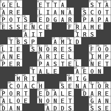 ACROSS 1. Set 4. Singer James 8. R.R. building 11. "We ___ not amused" (Victoria) 12. Woody, climbing, usually tropical plant 14. Highlander 15. Plant holders 17. _ Allan Poe 18. Dad 19. Substance 21. Movie unit 23. Small island 24. Big collection agency 25. Cook's measure (abbr.) 27. Among 30. Untruth 31. Sounds asleep 34. Egg _ yung 37. One (Scot) 38. Satellite of Uranus 39. Naughty child 40. For each 41. Soft color 43. Fish or hair follower 44. Falsehood 45. A really long time 47. Medical imaging device (abbr.) 49. Russian fighter aircraft 50. Team commander 52. Legislator 56. Sweet dark-red dessert wine 57. Peak District village in England 60. Have the gumption 61. _ vera 62. Music written for nine 63. Separate the seeds from cotton 64. One of the 12 tribes of Israel 65. Does sums 66. Compass dir. DOWN 1. Stare wonderingly 2. Greek god of love 3. Allows 4. Voters do this 5. Event that recurs at intervals 6. Label 7. Santa ___, CA 8. Fraudulent business schemes 9. Drink excessively 10. "One Day ___ Time" 13. Sandy's bark 14. Coast Guard woman 16. Oceans 20. Pinches, bites 22. To free from 25. Prong on a fork 26. Fermented drink made from hops 27. Originate 28. Confront 29. Capri or Wight 30. Infant locale 32. California wine valley 33. Spoken 34. A pale, very dry sherry 35. Sign of things to come 36. Choose 42. (Had) reclined 44. Nervous spasm 46. Mild oath 47. Person of subnormal intelligence 48. Assign a rank or rating to 49. Confronts 50. Root beer relative 51. Layer 52. Downhill vehicle 53. Labels 54. Mouths or openings 55. French philosopher Descartes 56. Groovy apt. 58. ___ good deed 59. Added to