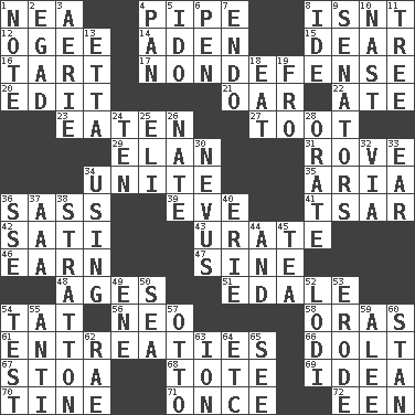 ACROSS 1. Teachers' org. 4. Corncob 8. Is not 12. Double curve, resembling the letter S 14. Arabian gulf 15. Letter starter 16. Small pie 17. Unrelated to defense, as in spending 20. Prepare for publication 21. Boat paddle 22. Had dinner 23. Eroded 27. A blast of a horn 29. Flair 31. Be footloose 34. Join together 35. Roberta Peters solo 36. Backtalk 39. Night before a holiday 41. Russian ruler of old 42. Suttee (variant) 43. A salt of uric acid 46. Merit 47. Trig term 48. Eons 51. Peak District village in England 54. Make lace 56. Modern: prefix 58. Mouths or openings 61. Pleas 66. Dunce 67. Portico 68. Haul 69. The main thing one is thinking about 70. Prong on a fork 71. Single time 72. Car or cant ending DOWN 1. Make mention of 2. Mild oath 3. Nest on high 4. Baking dish 5. Wedding promise 6. Fenced enclosure 7. Inside; within (prefix) 8. Binary compound 9. Elected representatives 10. Political cartoonist Thomas 11. Relationship diagram 13. Singer James 18. Ingest 19. Away 24. "___ Little Indians" 25. Connecticut Ivy Leaguer 26. Nathan's nickname 28. Speak pompously 30. Congenital growth or mark on the skin 32. By way of 33. Ewer handle 34. Exploiting 36. Compass dir. 37. American Automobile Association (abbr.) 38. Ski resort town in Vermont 40. 4th largest of the Great Lakes 44. Also 45. Beverage made from leaves 49. Compass dir. 50. Ocean 52. Farming town in central California 53. Wear away 54. Trial 55. Against 57. Von Bismarck 59. Toward shelter 60. Comedian Laurel of Laurel & Hardy 62. Actress Charlotte 63. Electrically charged atom 64. And so on (abbr.) 65. Observe