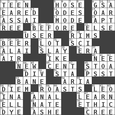 ACROSS 1. Adolescent 5. Stockings 9. Girls' org. (abbr.) 12. Having ears or earlike features 14. Lyric poems 15. Boat paddle 16. Slender Brazilian palm 17. Method 18. Fitting 19. Portuguese money of account (variant) 20. Prior to 23. Otherwise 24. One who uses or employs something 25. Basketball hoops 27. Fermented drink made from hops 30. Car dealer's back yard 32. _-fi 33. Jai ____ 34. Kill 36. Epoch 38. Wind 39. Eisenhower's nickname 40. Born 43. ___ Haven, CT 46. Penny 48. Portico 49. HTML Container Element 51. R.R. building 52. Inconspicuous attention getter 53. Object of repulsion 54. Roberta Peters solo 56. South Vietnam president (1954) 58. Exposes to great heat 61. Lion 64. _ tizzy (2 wds.) 65. Of or related to the anus 66. Memorize 68. Pipe bend 69. Nathan's nickname 70. Moral principle 71. Color 72. American tennis player Robert 73. Algonquian DOWN 1. Lacerate 2. Relaxation 3. Celtic language 4. Teachers' org. 5. Like (prefix) 6. Scent 7. Spring feasts 8. Compass dir. 9. Scores awarded for successful feats 10. Plant excrements 11. Johnson of "Laugh-In" 13. Rights 21. Snakelike fish 22. Romp 23. Independent ruler or chieftain 24. RI univ. 26. Frozen water 27. Sound made by sheep 28. Connecticut Ivy Leaguer 29. Merit 31. Receives possession of 35. Gossips 37. Pismires 41. Greek goddess of the dawn 42. Ingest 44. Dutch treat 45. Acquire through effort 47. Small pie 48. Health resort 50. Actresses Bloom and Felton 53. Calif. Air Force Base 55. Capri or Wight 56. Passed on 57. In an inward manner 59. Pledge 60. Toward shelter 61. Cowardly lion portrayer 62. One of the Great Lakes 63. At one time in the past 65. Santa ___, CA 67. And so on (abbr.)