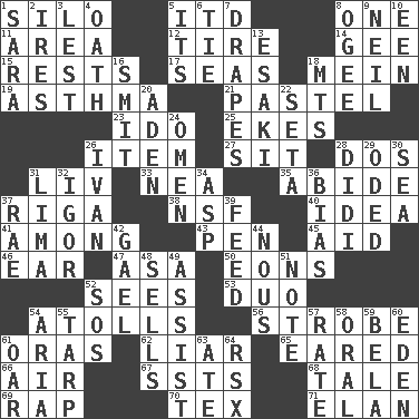 ACROSS 1. Grain storage tower 5. It would 8. Single 11. Length times width 12. Become fatigued 14. Unit of force equal to gravity 15. Musical pauses 17. Oceans 18. Chow _ 19. Respiratory problem 21. Soft color 23. Wedding promise 25. Supplements with great effort 26. A distinct part 27. Be seated 28. Two (Sp.) 31. 54 in ancient Rome 33. Teachers' org. 35. Remain 37. Port city in Latvia 38. Science/research agcy. 40. The content of cognition 41. Amid 43. Writing instrument 45. Assist 46. Ewer handle 47. White ___ sheet 50. Immeasurably long periods of time 52. Observes 53. Superhero pair 54. Ringlike coral islands and reefs 56. Disco prop 61. Mouths or openings 62. One who doesn't tell the truth 65. Having ears or earlike features 66. Wind 67. Fast planes 68. Lie 69. Strike 70. John Ritter's dad 71. Flair DOWN 1. "Two Mules for Sister ____" 2. Angers 3. For fear that 4. Pledge 5. It is 6. Make a knot 7. Window treatments 8. Double curve, resembling the letter S 9. Famous astronaut Armstrong 10. Car or cant ending 13. 1973 Nobel Price Winner (Physics) Leo 16. Stricken, poetically 18. Mountains (abbr.) 20. An important port of Yemen 22. Bristle 24. Sign of things to come 26. _ the terrible 28. "You Light Up My Life" star Conn 29. Wrote a lyric poem 30. Ocean 31. Pale green bean 32. Composer Stravinsky 34. Viper 36. Prejudice 37. Actress Charlotte 39. Nourish 42. Highlander 44. Common sense 48. Makes a sale 49. Aid 51. Observe 52. Distress signal 54. Operatic vocal solo 55. Canvas cover 57. Pace 58. Spoken 59. Actor Lugosi 60. Genesis locale 61. Rowing implement 63. Had dinner 64. Acura sports coupe