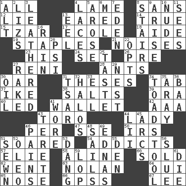 ACROSS 1. Everything 4. Unable to walk 8. Without 12. Whopper 13. Having ears or earlike features 14. Loyal 15. Russian ruler 17. Learning spot: Fr. 18. Helper 19. Paper fasteners 21. Annoying sounds 23. Part of HMS, perhaps 24. Put into a specified state 26. Before (prefix) 27. Painter Guido (1575-1642) 28. Pismires 30. Boat paddle 31. College papers 34. Bar bill 37. Eisenhower's nickname 38. Table seasonings 39. Mouth or opening 40. Directed 41. Place for singles 42. Auto club (abbr.) 43. "Corrida" creature 44. Kenny Rogers chart-topper in '80 46. For each 47. Compass dir. 50. Big collection agency 51. Flew 54. Inveterate users 57. Writer Wiesel 58. Place in a line 60. Exchanged or delivered for money 62. Left 63. Pitcher Ryan 64. Fr. "Yes" 65. Characteristic smell of wine 66. Global Positioning Systems (abbr.) 67. Area sheltered from the wind DOWN 1. The first octave above the treble staff 2. Belonging to Elizabeth 3. Tough but pliablecoriaceous 4. Shoestrings 5. Came up 6. Cartoonist voice _ Blanc 7. Locale of original sin 8. Flight of steps 9. Originate 10. Unadorned 11. Perceives with the eye 13. Snakelike fish 16. Water falling in drops from the sky 20. 23rd letter of the Greek alphabet 22. Elects 25. Clothes sense 27. Libertine 29. Egg locale 30. Petroleum 31. Russian ruler of old 32. Saint headwear 33. Pipe bend 34. Inedible or poisonous agaric 35. Like ___ of sunshine 36. Sound made by sheep 41. Had on 43. Cigar-shaped 44. Cards in a Roman deck? 45. Arches 46. Aches 48. Travels by water 49. Ferber et al. 51. Stitched 52. Butter sub 53. Mild oath, euphamism for damn 55. Lair 56. Turn sharply 59. Trim (branches) 61. Expire