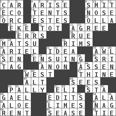 ACROSS 1. 4-wheeled motor vehicle 4. Ascend 9. Stricken, poetically 13. Environmental prefix 14. Portable shelters 15. Characteristic smell of wine 16. The grampus (Milton) 17. _____ Park, CO 18. Spanish pot 19. Make supply last 21. Small child 22. Match 24. Blunders 26. Regret 27. Taiwanese island in East China Sea 29. Basketball hoops 30. Satellite of Uranus 31. It may be bright or harebrained 33. Leather borer 36. Elected rep. 37. Taking place subsequently 40. Indian title of respect (Mr.) 41. Label 42. At once, immediately (arch.) 43. NE Netherlands city 45. Compass direction 47. One or ones belonging to thee 48. The first octave above the treble staff 49. Observes 50. Friendly 52. Biblical high priest 54. R.R. building 56. Highlander 57. Proofreads 59. Chicken ___ king 61. Medicinal plant 62. Citrus fruits 63. Tired old horse 64. Monthly bill 65. Gospel singer Marvin 66. Make a knot DOWN 1. Corporate head (abbr.) 2. 43,560 square feet 3. Shooting up abruptly 4. Had dinner 5. Musical pauses 6. To the inside or interior of 7. Proofreading order 8. Curvy letter 9. Sounds asleep 10. Undercover agent 11. Capri or Wight 12. Afternoon social gathering 20. Celtic language 22. Believer in; advocate of (suffix) 23. Chewing product 25. General guideline 27. Vertical spar for supporting sails 28. Length times width 29. It's straight from the horse's mouth 31. Is not 32. Superhero pair 33. Aide 34. Songbird 35. Actor's bit 38. Offensive 39. Yard entry 44. "______ My Girl" (Turtles hit) 45. Place for singles 46. Pipe bend 49. Locates 50. Diluted with white 51. A really long time 52. Singer Brickell 53. Pale green bean 55. Mountain range southwest of Kyrgyzstan 56. Slender fish 57. Raised railways 58. Compass dir. 60. Mature