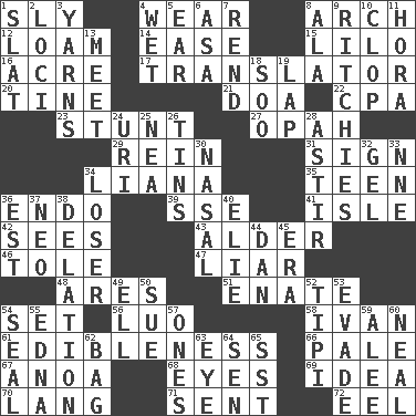 ACROSS 1. Stealthy 4. Put on (as clothing) 8. Bowlike part 12. Rich soil 14. Comfort 15. _ and Stitch 16. Measure of real estate 17. Interpreter 20. Prong on a fork 21. ___ good deed 22. Tax preparer (abbr.) 23. Check the growth or development of 27. Brightly colored fish 29. It's straight from the horse's mouth 31. Attach a signature 34. Woody, climbing, usually tropical plant 35. Adolescent 36. Inside; within (prefix) 39. Compass dir. 41. Capri or Wight 42. Observes 43. Tree or shrub in the Birch family 46. Lacquered or enameled metalware 47. One who doesn't tell the truth 48. Ancient Greek god of war 51. Related on the mother's side 54. Put into a specified state 56. Nilotic language 58. _ the terrible 61. The property of being fit to eat 66. Diluted with white 67. Small Philippine buffalo 68. Sight organs 69. The content of cognition 70. Long (Scottish) 71. Posted 72. Snakelike fish DOWN 1. Narrow board 2. Locales 3. Entertaining tales 4. Dripping 5. Ewer handle 6. White ___ sheet 7. Tear apart 8. Insect wing 9. Actors Guy, Robert Welles, and Clint 10. Hoof sound 11. Israeli folk dance 13. Rendezvous 18. "Barney Miller" actor Jack 19. Infant locale 24. RI univ. 25. Teachers' org. 26. Metal containers 28. Moving or stirring 30. Relating to the nose 32. Set 33. Compass dir. 34. Failure 36. Eastern Standard Time (abbr.) 37. Modern: prefix 38. Conveyance 40. Writer Wiesel 44. One of the 12 tribes of Israel 45. Period 49. Pipe bend 50. Take to court 52. Native american tent (variation) 53. Dodge 54. Lick closed 55. Pulitzer Prize-winning author Ferber 57. Washington bills 59. Toward shelter 60. Anneal 62. Paper or plastic container 63. Sight organ 64. Elected rep. 65. Fast jet (abbr.)