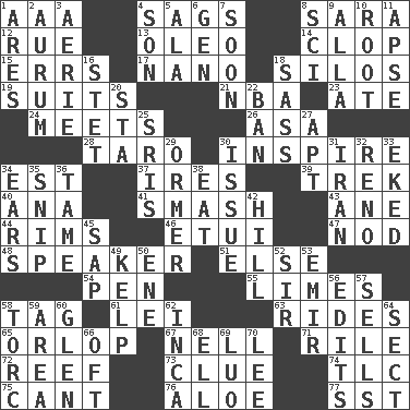 ACROSS 1. American Automobile Association (abbr.) 4. Droops 8. "Two Mules for Sister ____" 12. Regret 13. Margarine 14. Hoof sound 15. Blunders 17. Billionth: prefix 18. Grain storage towers 19. Costumes for special activities 21. Basketball assoc. 23. Had dinner 24. Confronts 26. White ___ sheet 28. Edible starchy tuberous root 30. Stimulate to action 34. Eastern Standard Time (abbr.) 37. Angers 39. Long journey 40. Santa ___, CA 41. Box-office sellout 43. One (Scot) 44. Basketball hoops 46. Needle holder 47. Lower and raise head in agreement 48. Orator 51. Otherwise 54. Animal enclosure 55. Citrus fruits 58. Label 61. Luau accessory 63. Amusement-park features 65. Fourth or lowest deck 67. 1994 drama film starring Jodie Foster 71. Cause heat under the collar 72. Coral collection 73. A slight indication 74. Affectionate concern, for short 75. Patter 76. Medicinal plant 77. Fast jet (abbr.) DOWN 1. Ancient Greek god of war 2. Gold (Symbol: Au) 3. Nest on high 4. Boy, to dad 5. In the manner of 6. Commissioned military rank (abbr.) 7. Within a short period 8. _-fi 9. Silent film actress Nazimova 10. Carrot, for example 11. Domed church section 16. Proofreading order 18. Backtalk 20. R.R. building 22. Prohibit 25. Indian titles of respect 27. Fitting 29. Channel Islands abalone 30. Come out of 31. SW Asia republic 32. Western Nevada city 33. Supplemented with great effort 34. Hearing organs 35. Sever or remove by pinching or nipping 36. Not wild 38. Ingest 42. Land elevation 45. Plant excrement 49. Seaweed 50. Compass dir. 52. Title for a knight 53. Arab leader 56. Proofreads 57. Exchanges for money 58. Torque (variant) 59. Type of rug 60. Small, secluded valley 62. South American Indian 64. Religious group 66. Often (poetically) 68. Pipe bend 69. Nilotic language 70. Area sheltered from the wind