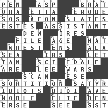 ACROSS 1. Writing instrument 4. Cleo's killer 7. Naughty child 11. Mouth or opening 12. Singer James 13. Eat (away) 14. Distress signal 15. A really long time 16. Chalkboards 17. _____ Park, CO 19. Helper 21. Morning condensation 23. Angers 24. Do some clerical work 25. Mature 26. Floor covering 29. Take or capture by force 30. Followers of ems 31. Chicken ___ king 32. Ocean 33. Big collection agency 34. Allow 35. Scottish cap 36. _-fi 37. Peak District village in England 40. "We ___ not amused" (Victoria) 41. Area sheltered from the wind 42. Armed conflicts 43. Examine minutely or intensely 45. Compass dir. 46. Determination 51. Man with strong sexual desires 55. Foolish or stupid persons 56. "You Light Up My Life" star Conn 58. "___ Maria" 59. Impressive in appearance 60. Writer Wiesel 61. Lair 62. Celtic language 63. Observe 64. Fast jet (abbr.) DOWN 1. Introduce or present, as a question 2. Greek god of love 3. Political cartoonist Thomas 4. Had dinner 5. Portico 6. Baking dishes 7. Naughty children 8. Round or rotation of duties 9. An important port of Yemen 10. Trial 12. Artist's stands 13. Otherwise 16. Titles for men of rank and authority 18. Singer Brickell 20. Public displays of written messages 22. Soggy 24. Movie unit 25. Nest on high 26. Shopping centers 27. Toward shelter 28. Make lace 29. Put on (as clothing) 32. R.R. building 33. Ancient Celtic tribe of eastern Britain 36. Narrow boards 37. She-sheep 38. Hyrax 39. Length times width 43. Took without asking 44. Quote 46. Trig term 47. Scent 48. Teases 49. Lyric poems 50. "Death on the ____" 52. Bits 53. Jacques Cousteau's middle name 54. Monthly bill 57. Expire