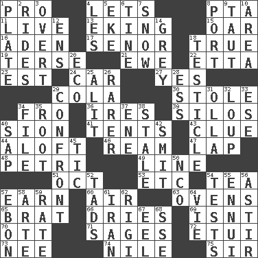 ACROSS 1. Adept person 4. Allows 8. Parent Teacher Assoc. 11. Not recorded 13. Supplementing with great effort 15. Rowing implement 16. Arabian gulf 17. Sir (Sp.) 18. Loyal 19. Laconic 21. She-sheep 22. Singer James 23. Eastern Standard Time (abbr.) 24. Auto 27. Consenting reply 29. Root beer relative 30. Took without asking 34. Back 36. Angers 39. Grain storage towers 40. The Jewish people; Israel 41. Portable shelters 43. A slight indication 44. Upward 46. 480, 500 or 516 sheets of paper 47. Pet locale 48. _ dish (used to culture cells) 49. Actor's bit 51. Sep. follower 53. And so on (abbr.) 54. Afternoon social gathering 57. Merit 60. Atmosphere 63. Baking chambers 65. Naughty child 66. Frees from moisture 69. Is not 70. Baseball player Mel 71. Gurus 72. Needle case 73. Born 74. The longest river in the world 75. Title for a knight DOWN 1. Food holder 2. Amusement-park features 3. Unconcealed 4. French article 5. Make supply last 6. Prong on a fork 7. Overwhelm 8. Left side of a ship or aircraft 9. Pulled tight 10. Type of rug 12. Followers of ems 14. Jennifer or Joel 18. One of the two male reproductive glands 20. Environmental prefix 25. Set down 26. More uncommon 28. Double-curved letter 29. Meet 31. Water jar 32. Central Nebraska county 33. Compass dir. 34. Do some clerical work 35. Carrot, for example 37. Compass dir. 38. Showing deterioration from age 40. Plant excrement 42. Stricken, poetically 45. Nervous spasm 50. Non-commissioned officer (abbr.) 52. Small amounts or degrees 54. Trials 55. World-weariness 56. Moving about 57. Inky black, to poets 58. Johnson of "Laugh-In" 59. Assign a rank or rating to 61. SW Asia republic 62. Swiss mountan, "Queen of the Mountains" 64. Compete 67. Snakelike fish 68. Compass dir.