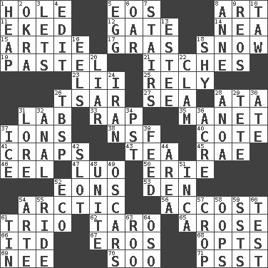 ACROSS 1. Opening into or through something 5. Greek goddess of the dawn 8. Nonscientific branch of learning 11. Supplemented with great effort 12. Yard entry 14. Teachers' org. 15. Nick name for Arthur 17. Pate de foie ____ 18. Overwhelm 19. Soft color 21. Irritating cutaneous sensations 23. Cards in a Roman deck? 25. Trust 26. Russian ruler of old 27. Ocean 28. _ moment's notice (2 wds.) 31. Experiment locale 33. Reproach for some lapse or misdeed 35. French painter Edouard 37. Charged particles 38. Science/research agcy. 40. ____ d'Azur (French Riviera) 41. Dice game 43. Beverage made from leaves 45. Actress Charlotte 46. Snakelike fish 47. Nilotic language 50. 4th largest of the Great Lakes 52. Immeasurably long periods of time 53. Lair 54. Northern region 56. Buttonhole 61. Musical group of three 62. Edible starchy tuberous root 65. Came up 66. It would 67. Greek god of love 68. Chooses 69. Born 70. "Barney Miller" actor Jack 71. Inconspicuous attention getter DOWN 1. Pile 2. Gumbo ingredient 3. Allows 4. Prepare for publication 5. Oval reproductive body of a fowl 6. Boat paddle 7. Flight of steps 8. Queen of England 1702-14 9. Vintage cars 10. The 23rd letter of the Hebrew alphabet 13. First name in cosmetics 16. Snakelike fish 18. Like a shrinking violet 20. One who doesn't tell the truth 22. Burrowing marine mollusk 24. SW Asia republic 26. Cook's measure (abbr.) 28. Small Philippine buffalo 29. False hair 30. Had dinner 31. Old wives' tales, e.g. 32. Of or related to the anus 34. Pacific Standard Time (abbr.) 36. Measure of real estate 37. Frozen water 39. Nourish 42. Slit 44. Length times width 48. Join together 49. Motion picture awards 51. South American Indian 52. Environmental prefix 54. Johnson of "Laugh-In" 55. Travel on an animal 57. Riding implement 58. I made a mistake 59. Fast planes 60. Trial 61. Metal container 63. Friend of Pooh 64. Bear (Spanish)