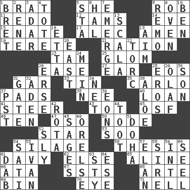 ACROSS 1. Naughty child 5. A female animal or person 8. Director Reiner 11. Do over again 12. Scottish caps 14. First lady 15. Maternal 17. Actor Baldwin 18. So be it 19. Cylindrical with tapered ends 21. Food allowance for one day 23. Scottish cap 25. Take by theft 26. Comfort 27. Ewer handle 28. Greek goddess of the dawn 31. Slender fish 33. Shallow baking pan 35. Monte _, Las Vegas Hotel/Casino 37. Writing tablets 38. Born 40. Grant temporary use of 41. Guide 43. Small child 45. Order of Saint Francis (abbr.) 46. "___ Little Indians" 47. Bear (Spanish) 50. Connecting point 52. Play the lead 53. "Barney Miller" actor Jack 54. Fodder prepared in a silo 56. College paper 61. American folk hero Crockett 62. Otherwise 65. Place in a line 66. "One Day ___ Time" 67. Fast planes 68. Johnson of "Laugh-In" 69. Storage container 70. Sight organ 71. 1994 drama film starring Jodie Foster DOWN 1. Cy Young winner Saberhagen 2. French philosopher Descartes 3. The sixth month of the Jewish calendar 4. Lug 5. R.R. building 6. Actor Linden 7. Develop 8. San ____ (Riviera town) 9. Baking chamber 10. Benjamin's nick name 13. Any of the three canals of the cochlea 16. Singer James 18. Direct toward a target or goal 20. 90 degrees 22. Torque (variant) 24. Chow _ 26. Celtic language 28. Greek god of love 29. Norwegian king 30. Male offspring 31. Yard entry 32. An important port of Yemen 34. Remaining after all deductions 36. _ vera 37. Pacific Standard Time (abbr.) 39. Immeasurably long periods of time 42. Roll call or roster of names 44. A blast of a horn 48. Gurus 49. Threatening words 51. Capital of the state of Qatar 52. Insidious 54. Suttee (variant) 55. _ the terrible 57. Style 58. Male parent of an animal 59. International (abbr.) 60. Stitch closed the eyes of (a falcon) 61. Pat or tap gently 63. Filthy place 64. Compass dir.