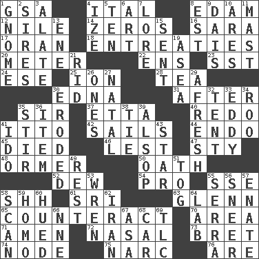 ACROSS 1. Girls' org. (abbr.) 4. Slanted text style (abbr.) 8. Dutch treat 12. The longest river in the world 14. Nothings 16. "Two Mules for Sister ____" 17. NW Algerian seaport 18. Pleas 20. Distance measurement 22. Followers of ems 23. Fast jet (abbr.) 24. Compass dir. 25. Electrically charged atom 28. Beverage made from leaves 30. Pulitzer Prize-winning author Ferber 31. Following 35. Title for a knight 37. Singer James 40. Do over again 41. "Tell ____ the Marines!" 42. Travels by water 44. Inside; within (prefix) 45. Passed on 46. For fear that 47. Filthy place 48. Abalone 50. Pledge 52. Morning condensation 54. Adept person 55. Compass dir. 58. Quiet! 61. _ Lanka 63. American astronaut and politician John 65. Neutralize 70. Type of rug 71. So be it 72. Rhinal 73. Cy Young winner Saberhagen 74. Thickened enlargement 75. Drug cop 76. "We ___ not amused" (Victoria) DOWN 1. Dwarf 2. Male parents of animals 3. Having winglike extensions 4. Ending with capital 5. "___ Little Indians" 6. Nonscientific branch of learning 7. Old wives' tales, e.g. 8. Eastern Standard Time (abbr.) 9. Raised platform 10. Ancient Greek god of war 11. Vertical spar for supporting sails 13. Compass dir. 15. Emitted 19. At sea 21. To free from 26. Washington bills 27. Brizilian seaport 29. Anew 30. Eaten away 32. Portable shelter 33. Whirlpool 34. Friend of Pooh 35. Use a swizzle stick 36. A whole individual unit 38. Neckwear 39. Columnist Joseph or Stewart 41. Wedding promise 43. Play the lead 49. State of inaction 51. Coat; cloak 53. Songbird 55. Spanish missionary in California 56. Scornful expression 57. Maternal 58. Skim 59. Same (prefix) 60. Took on color 62. SW Asia republic 64. Experiment locale 66. Compass dir. 67. White ___ sheet 68. Auto 69. Affectionate concern, for short