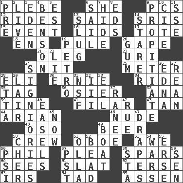 ACROSS 1. First-year military academy student 6. A female animal or person 9. Personal Computers (abbr.) 12. Amusement-park features 13. Stated 14. Indian titles of respect 15. Incident 16. Hats (slang) 17. Haul 18. Followers of ems 19. Whimper 20. Yawn 21. Cassini of fashion 23. RI univ. 24. In a ____ (agitated or irritated) 25. Distance measurement 28. Biblical high priest 30. Bert's buddy 34. Travel on an animal 35. Label 36. Flexible twig of a willow tree 38. Santa ___, CA 39. Prong on a fork 41. Of or pertaining to a thread or threads 43. Scottish cap 44. Believer in; advocate of (suffix) 46. Unadorned 48. Bear (Spanish) 49. Fermented drink made from hops 50. Group working together 51. Mitch Miller's instrument 53. Deep reverence 56. Silvers or Donahue 57. Entreaty 58. Practice fights 60. Perceives with the eye 61. Narrow board 62. Laconic 63. Big collection agency 64. Small boy 65. NE Netherlands city DOWN 1. Before (prefix) 2. Not recorded 3. Paradise 4. Gillaume's butler role 5. Eastern Standard Time (abbr.) 6. Travel by water 7. Flintstone garb 8. Begley and Asner 9. Appease 10. Quote 11. Compass dir. 13. A hard, heavy blow 14. A viewer who gazes fixedly 19. Stone: prefix 20. Chewing product 22. Whopper 24. Seigniories (variant) 26. Pulitzer Prize-winning author Ferber 27. 480, 500 or 516 sheets of paper 28. Singer James 29. Den 31. Science/research agcy. 32. One more than two 33. Snakelike fish 37. Indian princess (variant) 40. Artist's stands 42. Regret 45. Immediately 47. Window treatments 49. Water vessel 50. "Mermaids" star 51. Rounded earthenware pot or jar 52. Necklace unit 54. Armed conflicts 55. Celtic language 56. Air pressure measure (abbr.) 57. Pacific Standard Time (abbr.) 58. R.R. building 59. Elected rep.