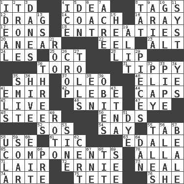 ACROSS 1. It would 4. It may be bright or harebrained 8. Labels 12. To draw with force 14. Team commander 16. Like ___ of sunshine 17. Immeasurably long periods of time 18. Pleas 20. Approach 22. Snakelike fish 23. The first octave above the treble staff 24. French article 25. Sep. follower 28. Mouth edge 30. "Corrida" creature 31. Likely to tip or tilt 35. Quiet! 37. Butter sub 40. Writer Wiesel 41. Independent ruler or chieftain 42. Military trainee 44. Smile enhancers 45. Not recorded 46. In a ____ (agitated or irritated) 47. Sight organ 48. Guide 50. Extremities 52. Distress signal 54. Declare 55. Bar bill 58. Purpose 61. Nervous spasm 63. Peak District village in England 65. Pieces 70. Silent film actress Nazimova 71. Den 72. Bert's buddy 73. Be tempered by heat 74. Johnson of "Laugh-In" 75. Wig 76. A female animal or person DOWN 1. Perfect 2. Marketplace scale 3. Natives or inhabitants of Denmark 4. Frozen water 5. Spanish title 6. Consume 7. Land measure 8. Make lace 9. Roberta Peters solo 10. Highlander 11. System (abbr.) 13. Girls' org. (abbr.) 15. The bottom of a shoe or boot 19. Set down 21. Friend of Pooh 26. Riding implement 27. For Whom the Bell _____ 29. Components 30. Triads 32. Live dramatic performance 33. Corncob 34. Affirmative reply 35. Stricken, poetically 36. Hub of activity 38. Car or cant ending 39. Off-Broadway awards 41. Raised railways 43. Inactive volcano in Sicily 49. Printing process, for short 51. Color 53. Trig term 55. Lies 56. Assad's deity 57. Calif. Air Force Base 58. Southern CA. univ. 59. Fly high 60. Give off 62. Certainty 64. Daniel's nick name 66. Before (prefix) 67. Compass dir. 68. Teat (slang) 69. Perceive with the eye