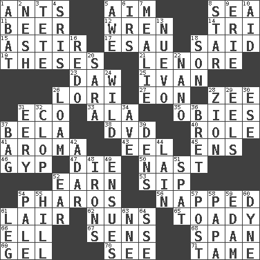 ACROSS 1. Pismires 5. Direct toward a target or goal 8. Ocean 11. Fermented drink made from hops 12. Songbird 14. Three (prefix) 15. Having gotten out of bed 17. Son of Isaac 18. Expressed in words 19. College papers 21. Poe poem 23. Fool 25. "Terrible" tsar 26. Australian parrot (variant) 27. A really long time 28. Last letter of the English alphabet 31. Environmental prefix 33. In the manner of 35. Off-Broadway awards 37. Actor Lugosi 38. Movie disc 40. Hero or heavy, e.g. 41. Scent 43. Snakelike fish 45. Followers of ems 46. Swindle 47. Expire 50. Political cartoonist Thomas 52. Merit 53. Small drink 54. N Egypt peninsula 56. Slept 61. Den 62. Religious women 65. Sycophant 66. Pipe bend 67. Elected reps. 68. Connect, as a bridge 69. Set 70. Observe 71. Docile DOWN 1. Blind as ____ 2. Tender 3. Wig 4. Indian titles of respect 5. Deep reverence 6. Big collection agency 7. Ear of corn 8. Play the lead 9. One of the Great Lakes 10. Help 13. New (sp.) 16. Make new 18. Male child 20. "Two Mules for Sister ____" 22. Billionth: prefix 24. Uncontrolled 26. Rich soil 28. The Jewish people; Israel 29. Snakelike fish 30. Compass dir. 31. Suggestive of the supernatural 32. Hoof sound 34. "___ Maria" 36. Cy Young winner Saberhagen 37. Container for groceries 39. Hiding places for outlaws 42. The sixth month of the Jewish calendar 44. (Had) reclined 48. Metal shackles 49. Takes place subsequently 51. Petty quarrel 52. Hearing organ 54. Light colored 55. Land elevation 57. Mail 58. Dad 59. Dutch treat 60. Centimeter-gram-second unit of force 61. Part of a journey 63. Compass dir. 64. Compass dir.